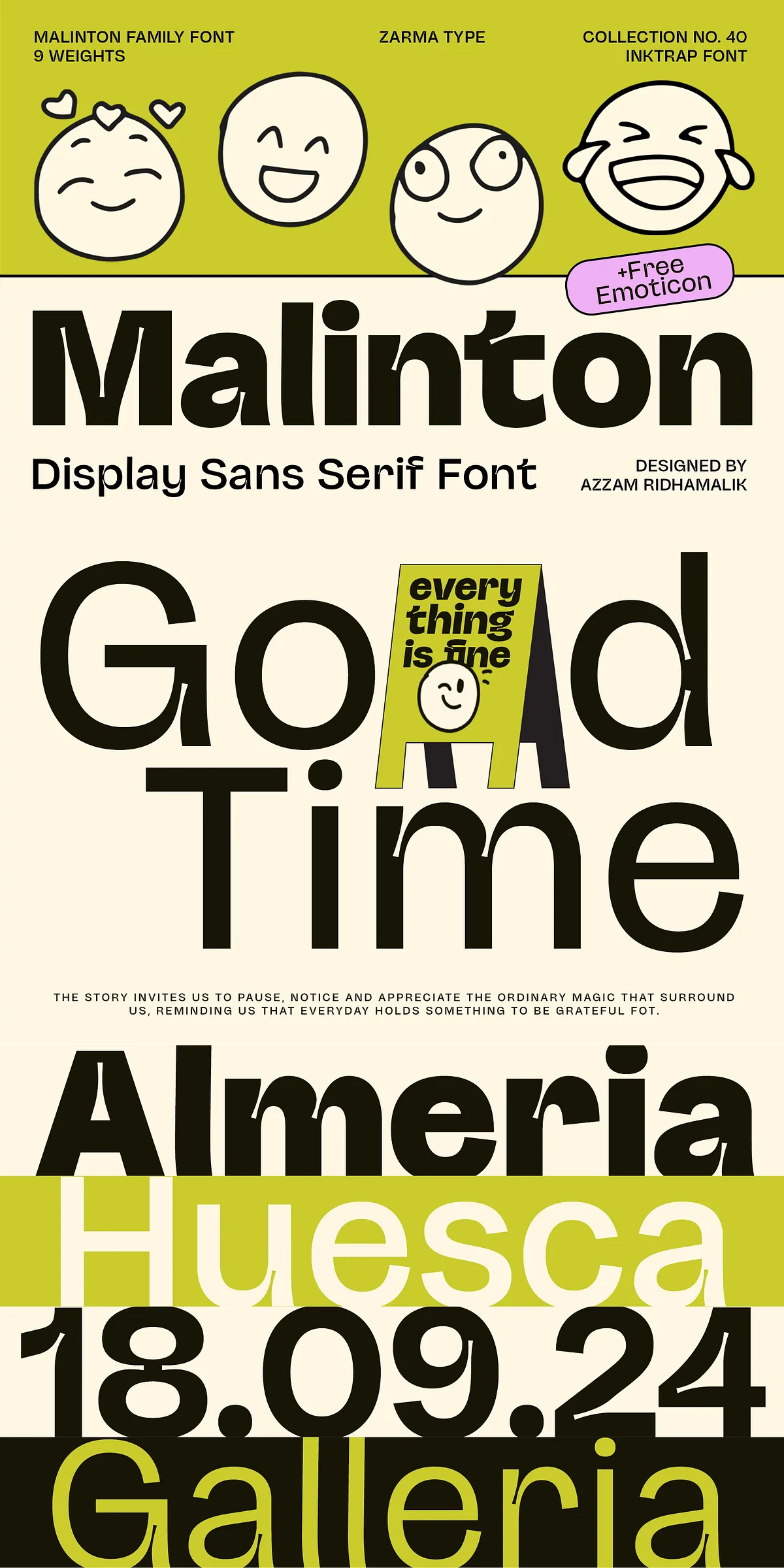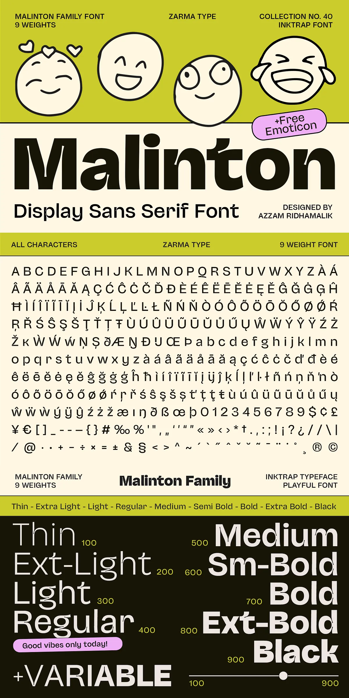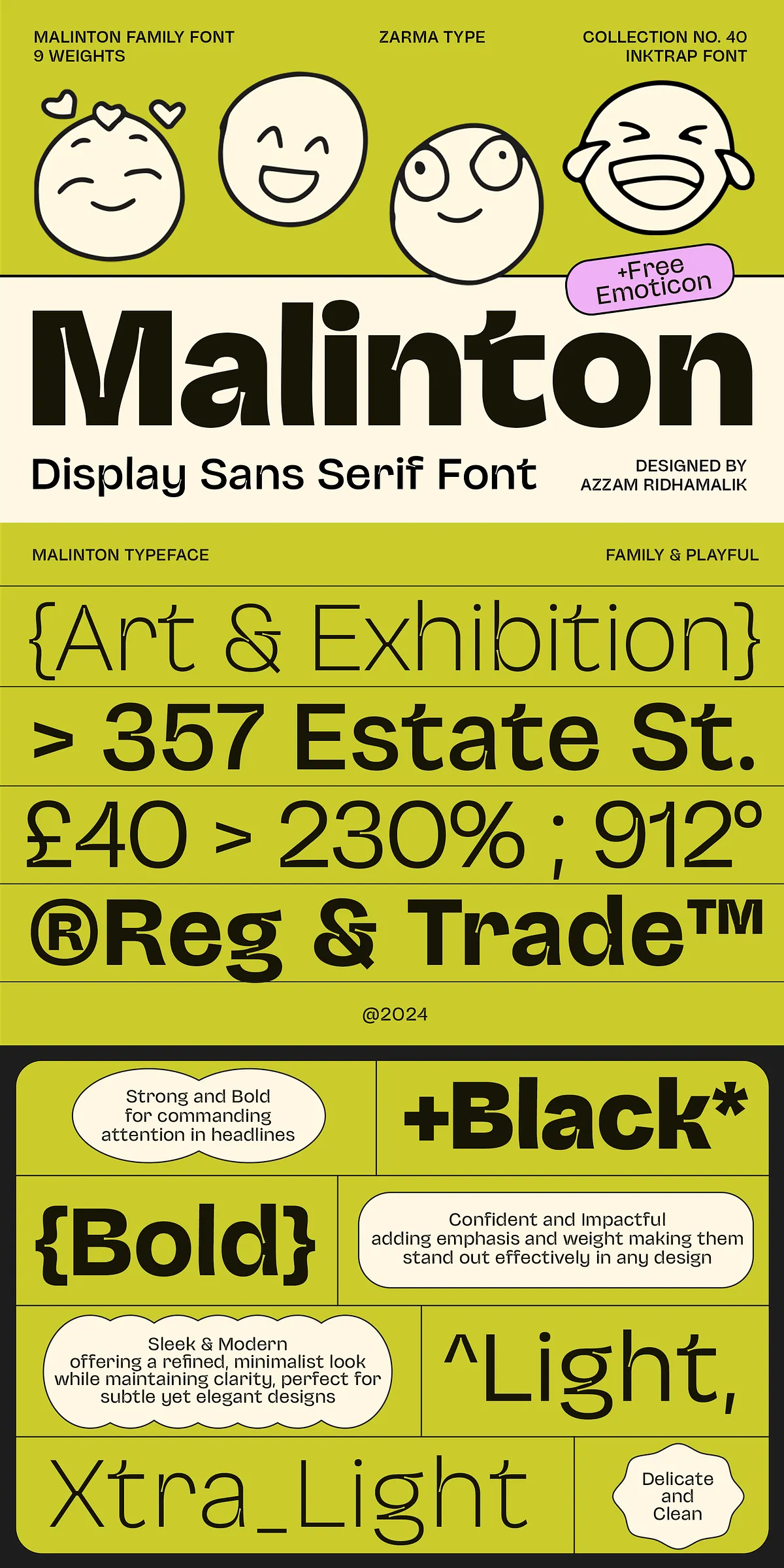 Meet Malinton, the display sans serif font family that doesn’t just convey text — it communicates mood, energy, and character. More than a font, Malinton is a creative catalyst. With nine distinct weights—from delicate Extra Light to powerful Black—you have the full spectrum of typographic expression at your fingertips. Whether you’re crafting a joyful social media post, a bold brand headline, or a serious editorial statement, Malinton adapts instantly, delivering impact with precision.