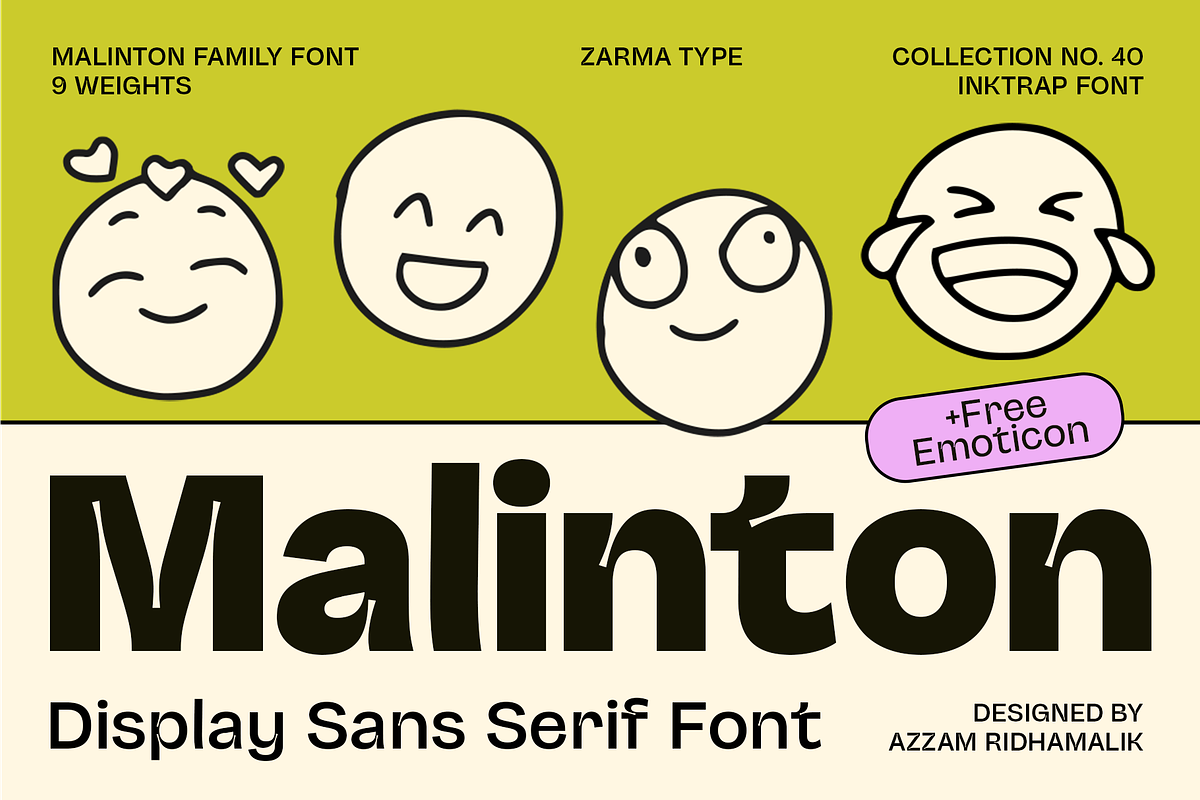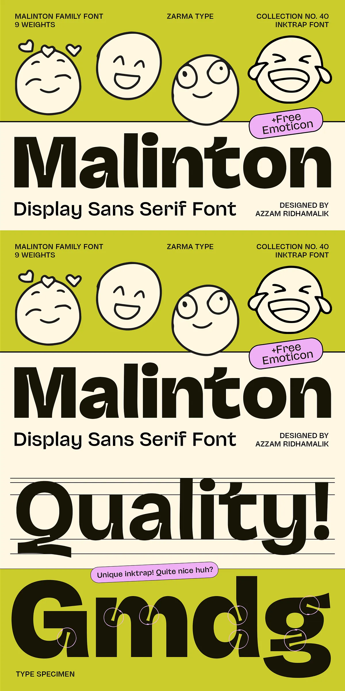 Malinton is engineered to stand out without sacrificing clarity. Its clean, modern sans-serif form ensures excellent readability at any size, while its unique inktrap design and slight humanist curves inject warmth and personality into each letter. This blend of professional structure and friendly flair makes Malinton the ideal bridge between high-energy creativity and polished presentation.