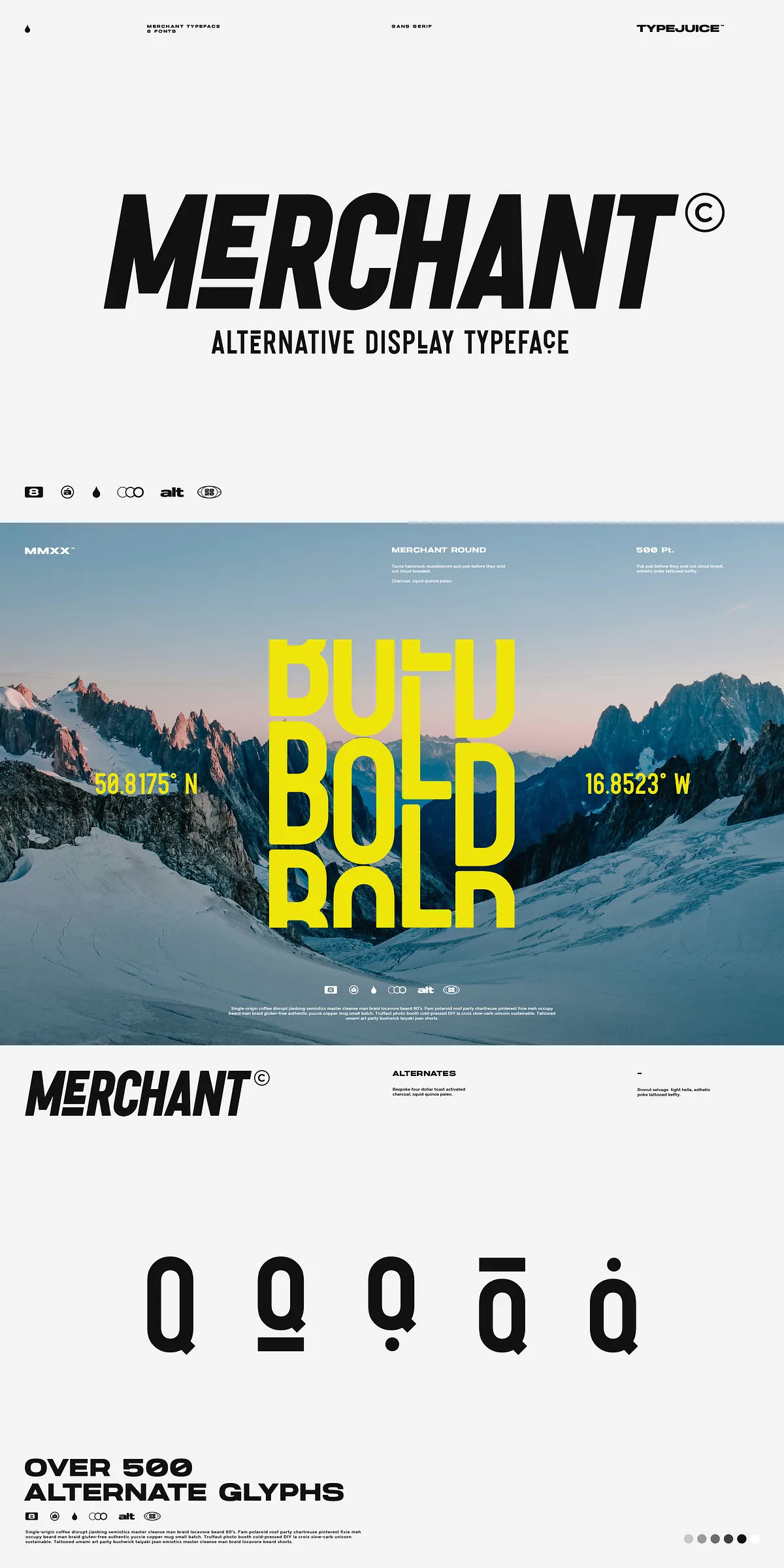 What sets Merchant apart is its over 500 stylized alternate glyphs — custom-designed replacements for standard characters that let your projects stand out. These alternates include ornamental forms, flourishes, custom terminals, and unique stylistic variations that turn routine text into artistic expression.