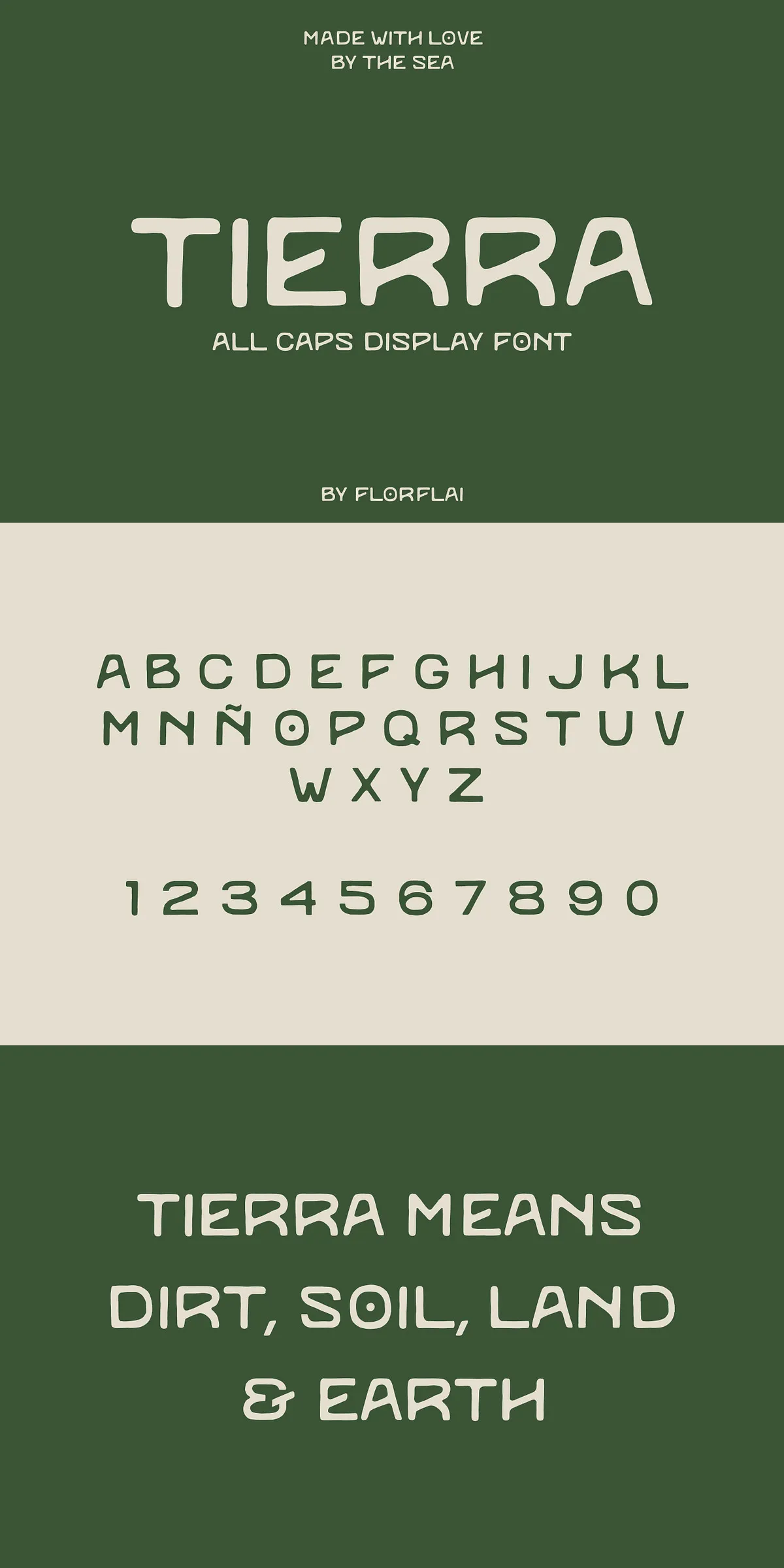 Step into the raw essence of the planet with Tierra, a powerful display font that captures the soul of the earth. In Spanish, “tierra” means land, soil, dirt, and earth — and this typeface lives up to that meaning. More than a font, Tierra is a design philosophy: unapologetically organic, deeply tactile, and profoundly grounded in nature’s quiet strength.