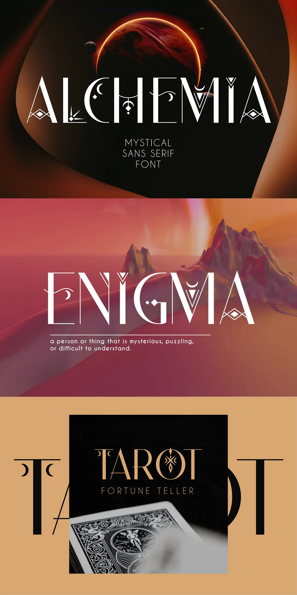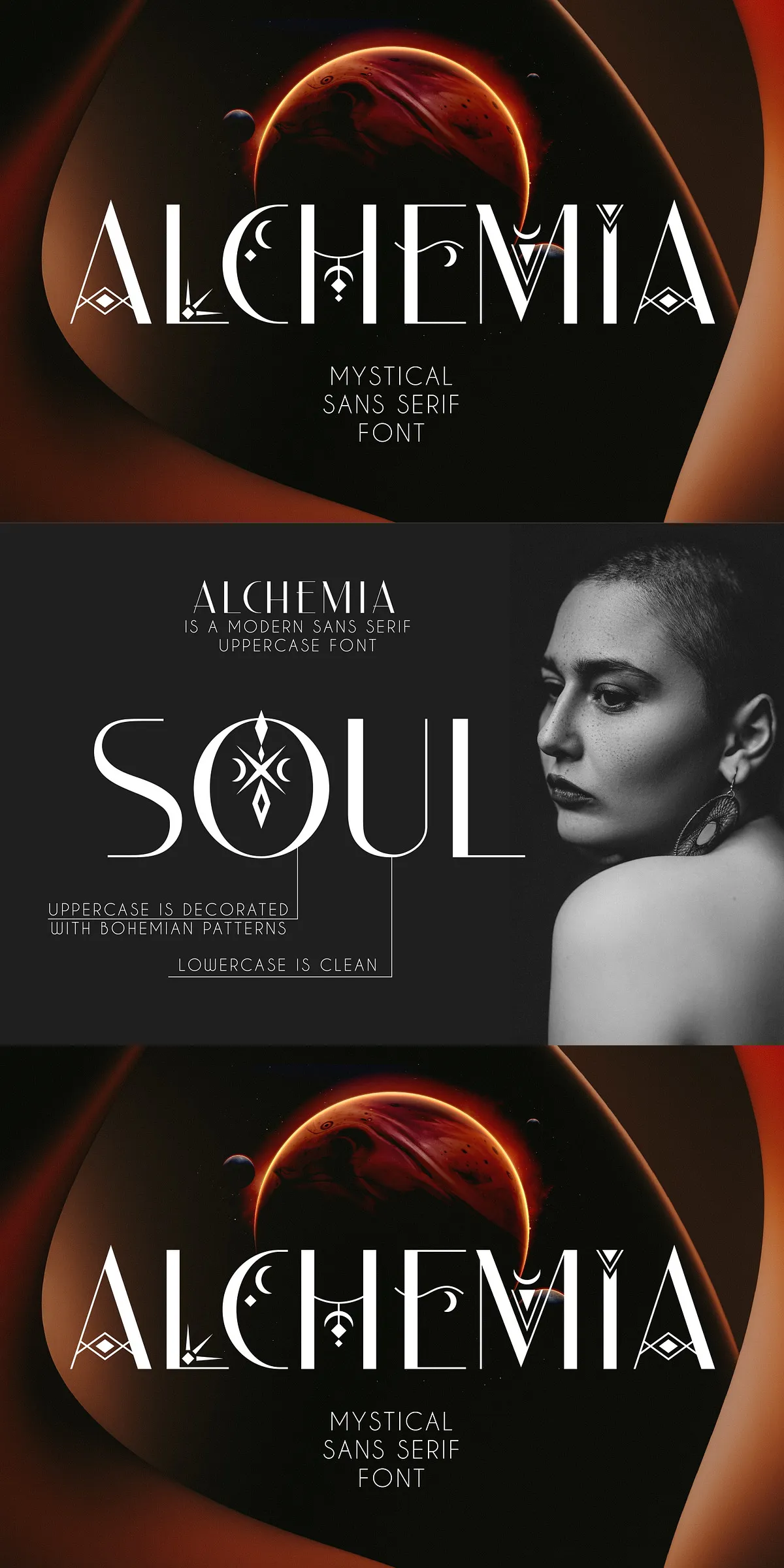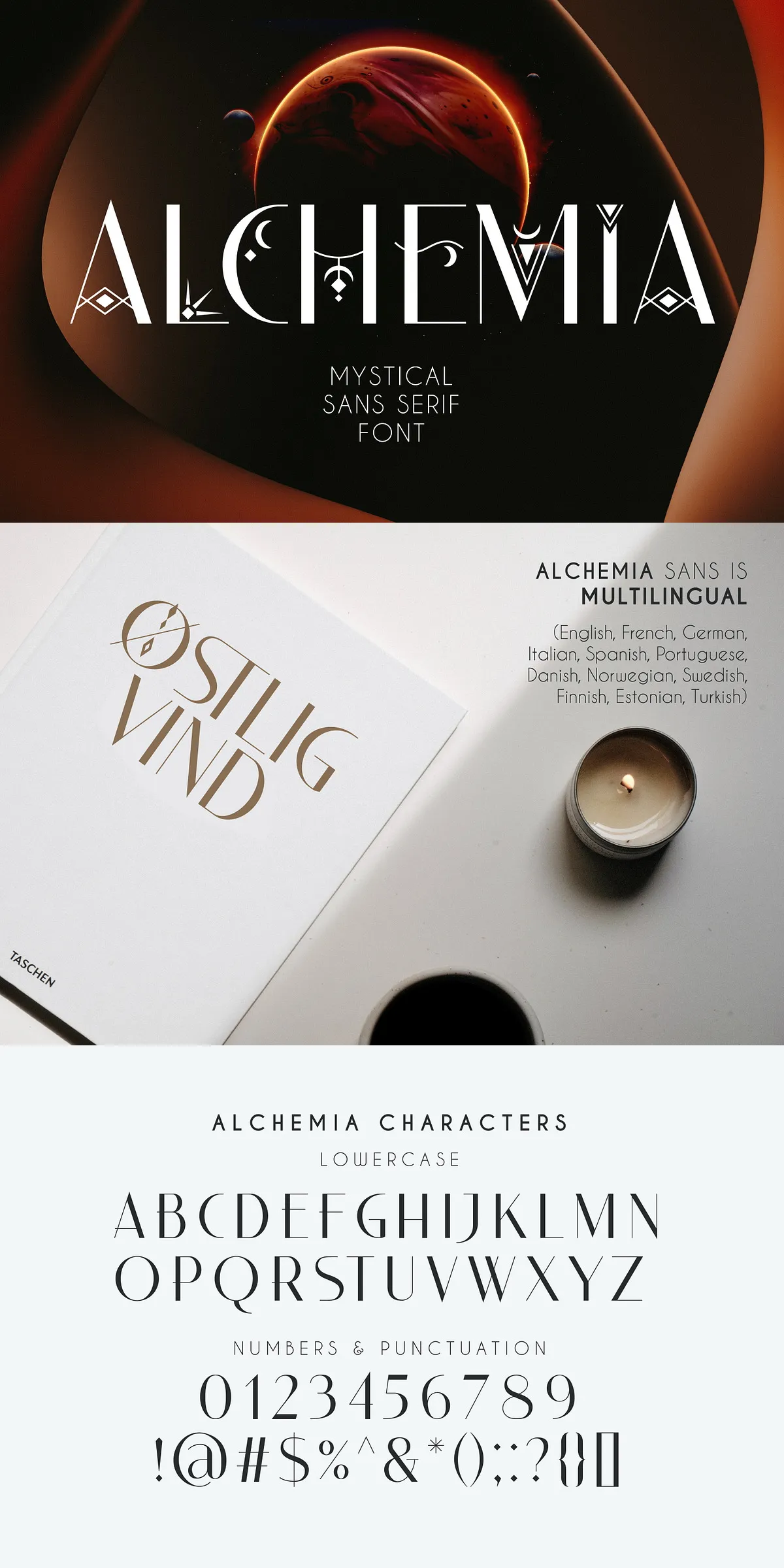 Step into a realm where typography meets mysticism. ALCHEMIA is not just a font — it’s an invitation to explore the unknown. Designed for creators who crave depth, character, and enchantment, ALCHEMIA fuses classic proportions with celestial motifs and bohemian-inspired decoration. This modern sans serif doesn’t merely convey text — it tells stories of stars, spells, and soulful expression.