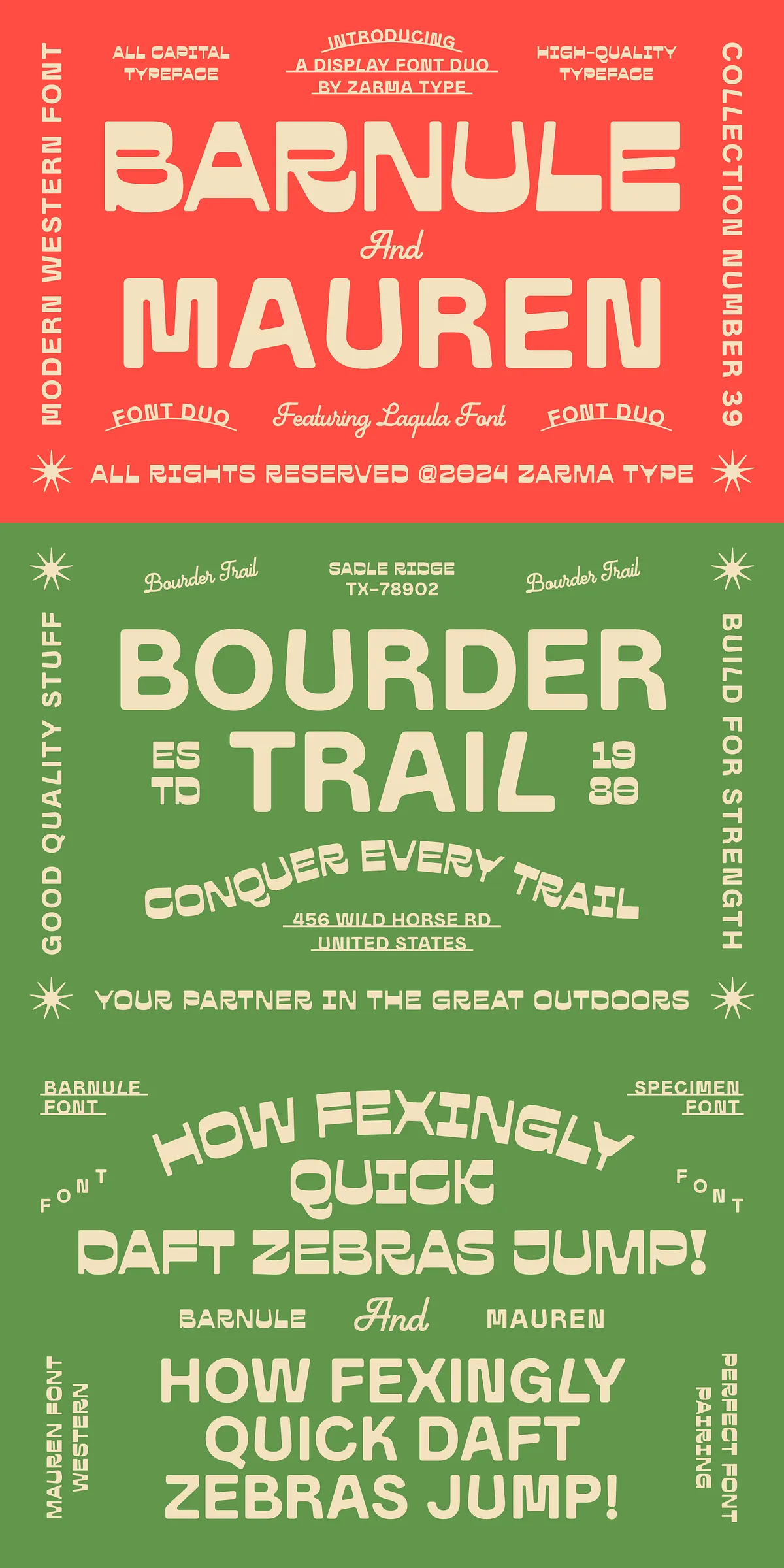 Bold. Confident. Irresistibly stylish. The Barnule and Mauren Font Duo isn’t just a typeface—it’s a statement. Designed for creators who value both striking presence and refined craftsmanship, this all-caps font duo captures the spirit of the American frontier with a modern twist. Its powerful character, soft-rounded edges, and clean geometric structure deliver a look that’s simultaneously rugged and refined. Whether you’re building a brand identity, designing apparel, or creating bold packaging, this font duo transforms ordinary text into unforgettable visual narratives.