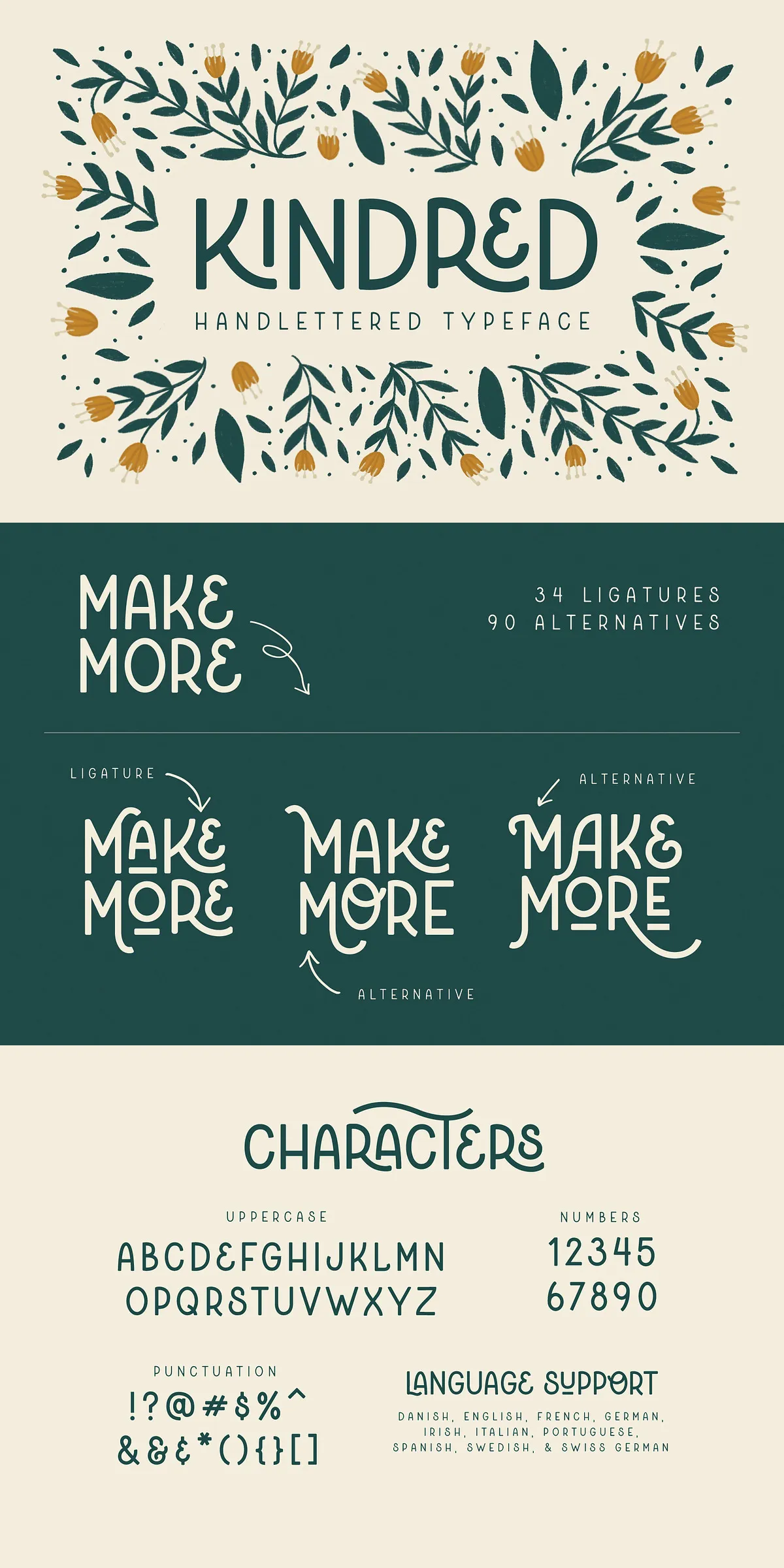 Kindred isn’t just beautiful — it’s custom-ready. With over 90 stylistic alternatives and 34 default ligatures, every word can be uniquely tailored to your vision. Here’s how:
