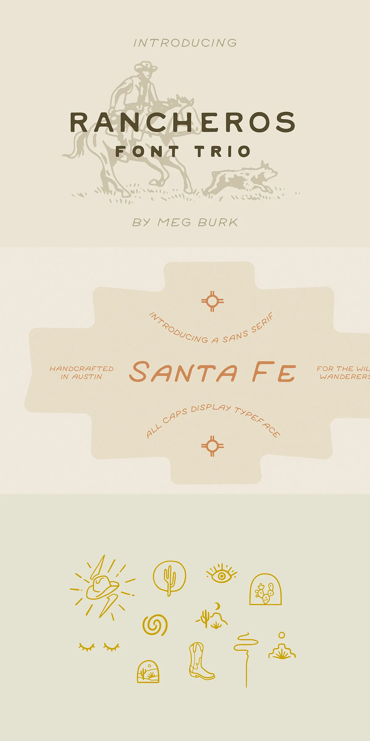 These aren’t just typefaces—they’re memories in script. Inspired by quiet mornings in Santa Fe, dusty trails in Taos, and starlit nights under the vast New Mexico sky, this trio was born from wanderlust and innocence. Each font carries a piece of the terrain: rugged but tender, wild but thoughtful, grounded in tradition yet bursting with new life.