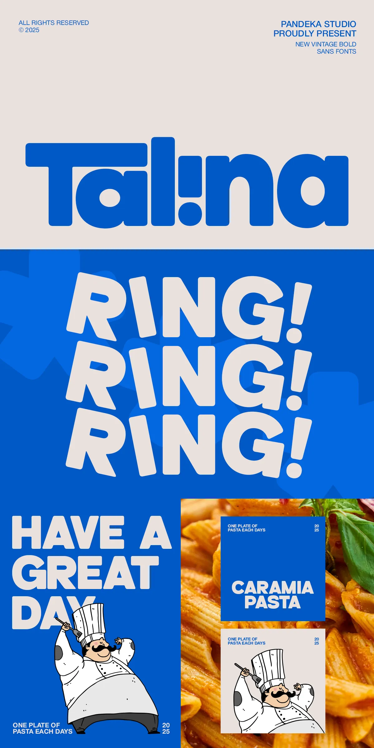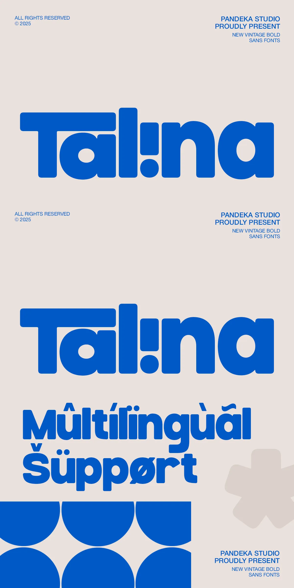Designed with both expressiveness and readability in mind, Talina strikes the perfect balance between fun and function. Its heavy, geometric curves deliver visual weight without sacrificing clarity. The consistent rhythm of the letterforms creates a polished, professional feel — even when the mood is playful. This makes it ideal for environments where boldness and approachability must coexist.