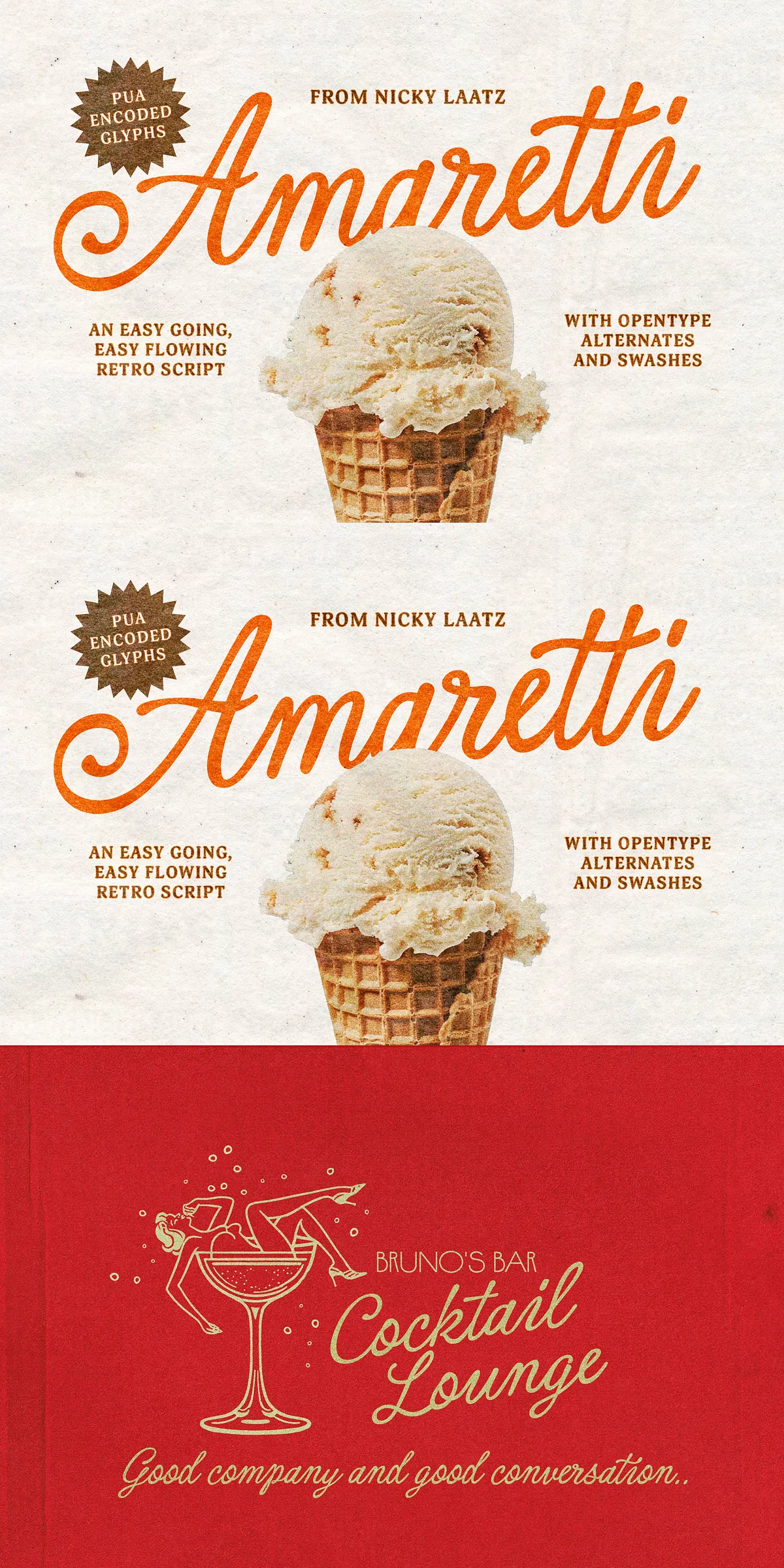 Amaretti is particularly suited for projects that aim to evoke a sense of vintage nostalgia coupled with elegance and playfulness. Use it for branding that demands a personal, handcrafted feel, signage that captures attention, packaging that exudes charm, or editorial layouts that benefit from sophisticated script accents. Its vintage inspiration makes it ideal for retro-themed events, artisanal product labels, boutique logos, and creative advertising campaigns seeking to stand out with a timeless aesthetic.