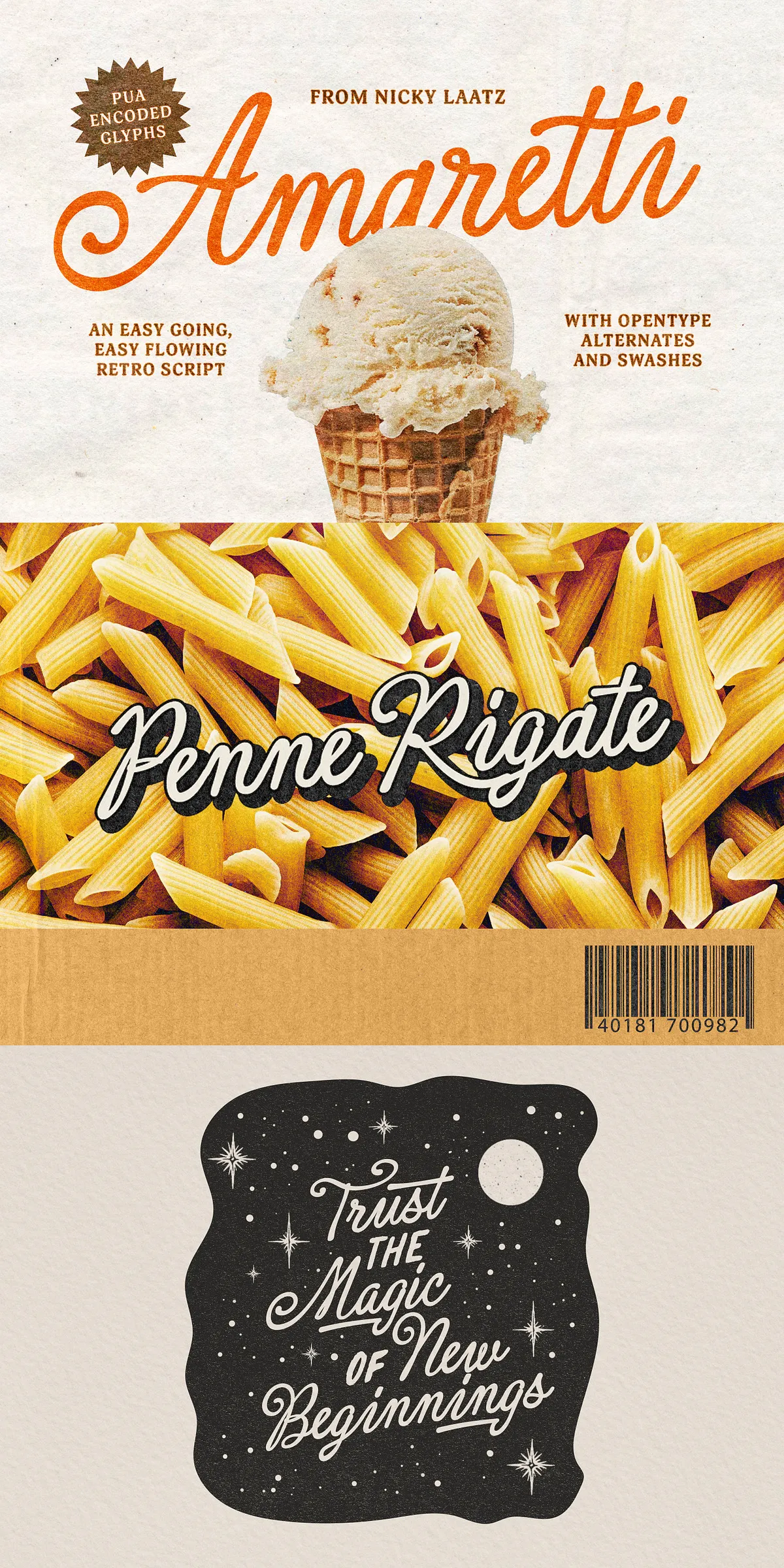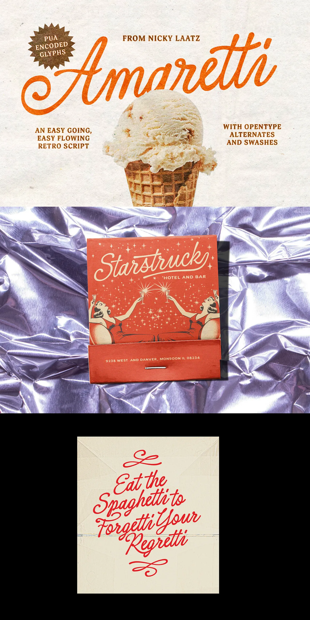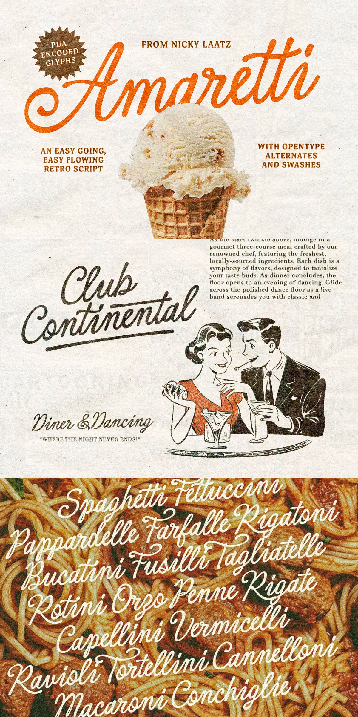 Amaretti is a beautifully designed calligraphic script font that captures the essence of vintage hand-lettered advertising and signage from the 1950s. This font draws inspiration from the elaborate scripts often seen in mid-century commercial art, evoking strong feelings of nostalgia, warmth, and familiarity. With its smooth, flowing strokes and sumptuous swirls, Amaretti brings a playful yet elegant tone to any creative project, adding vibrancy and nostalgic charm.