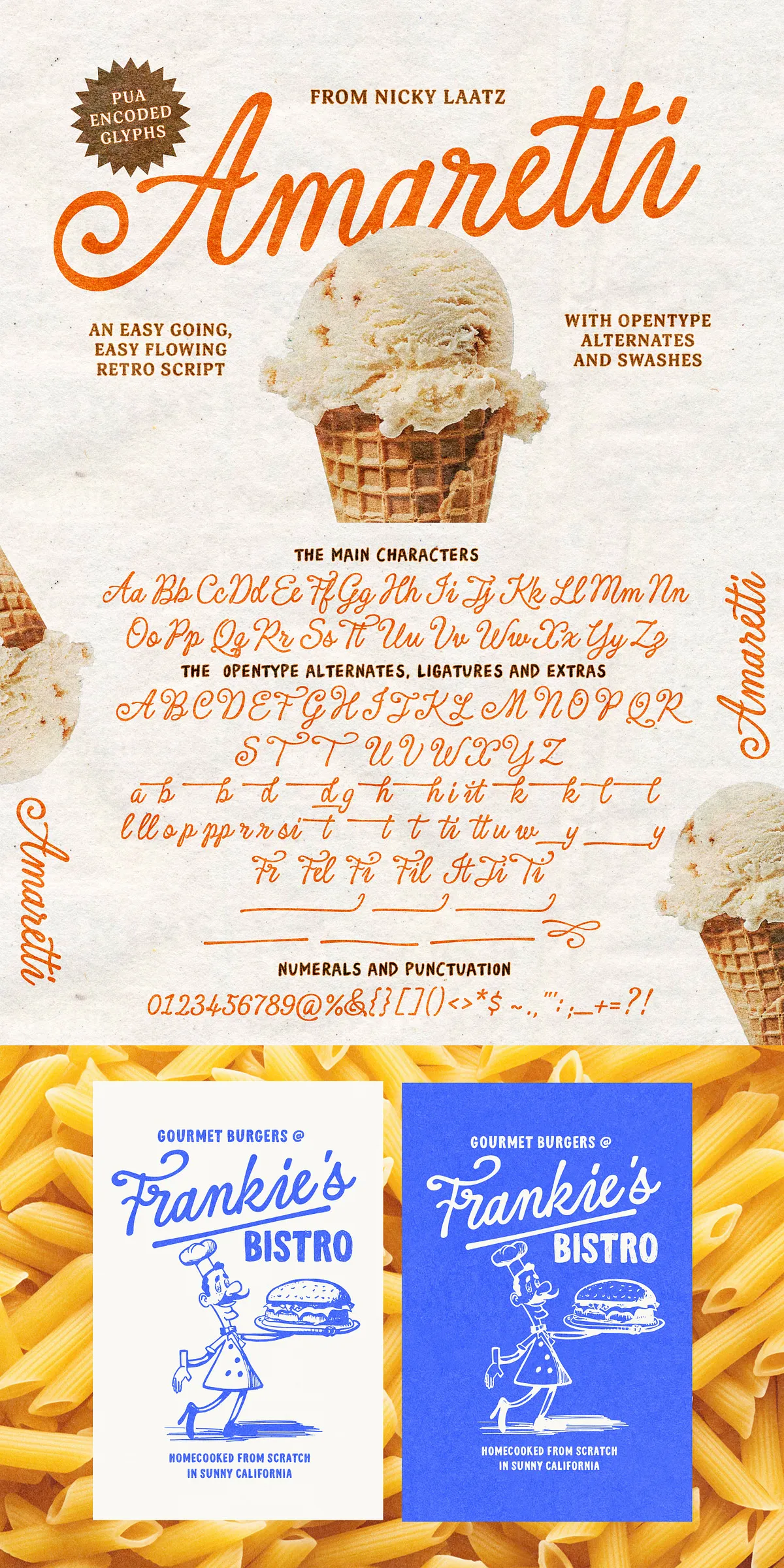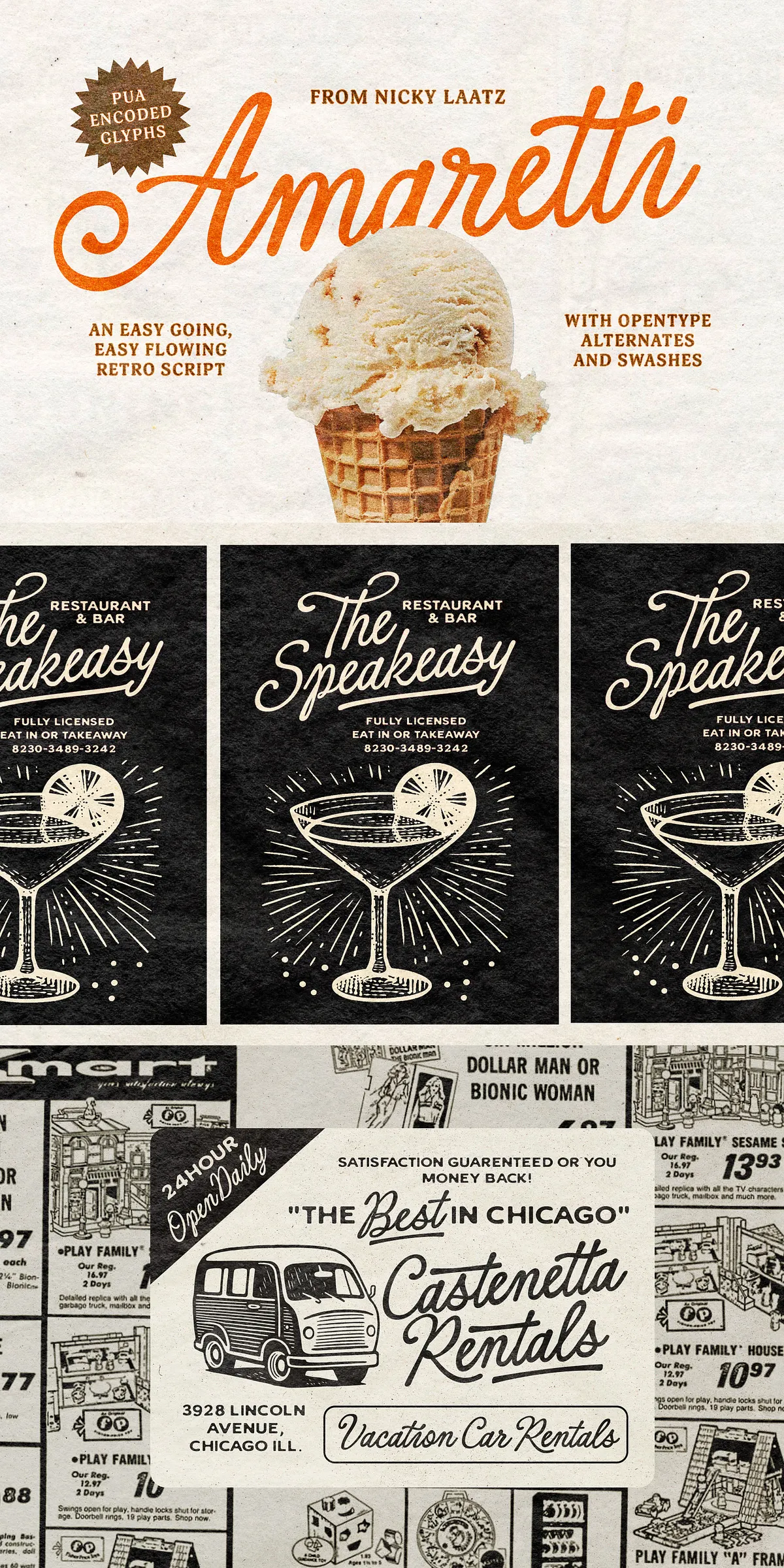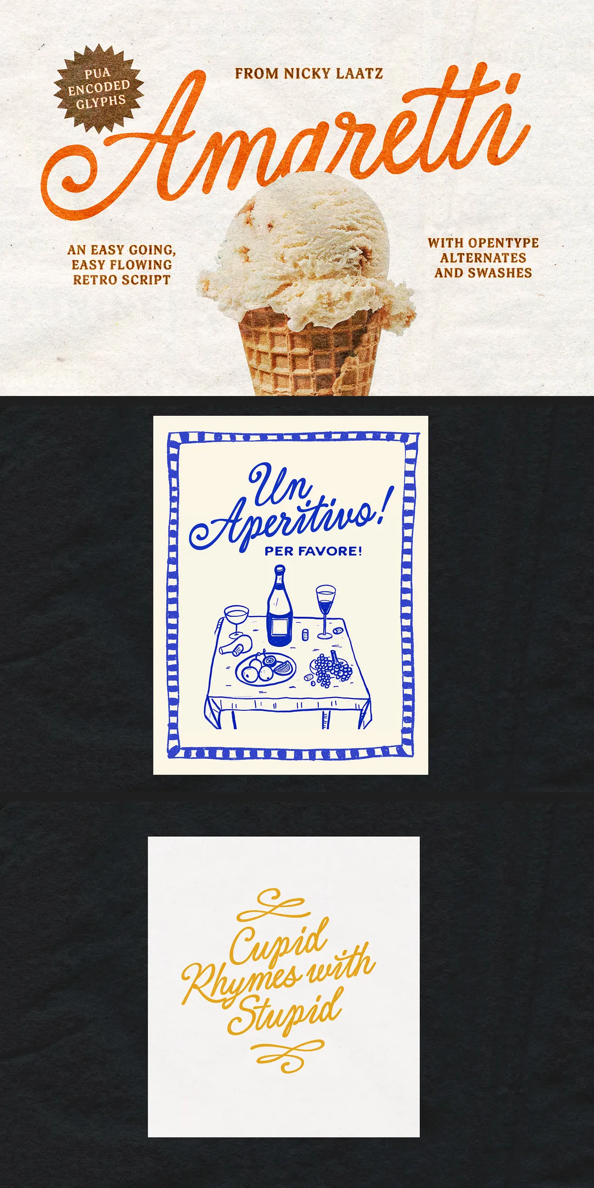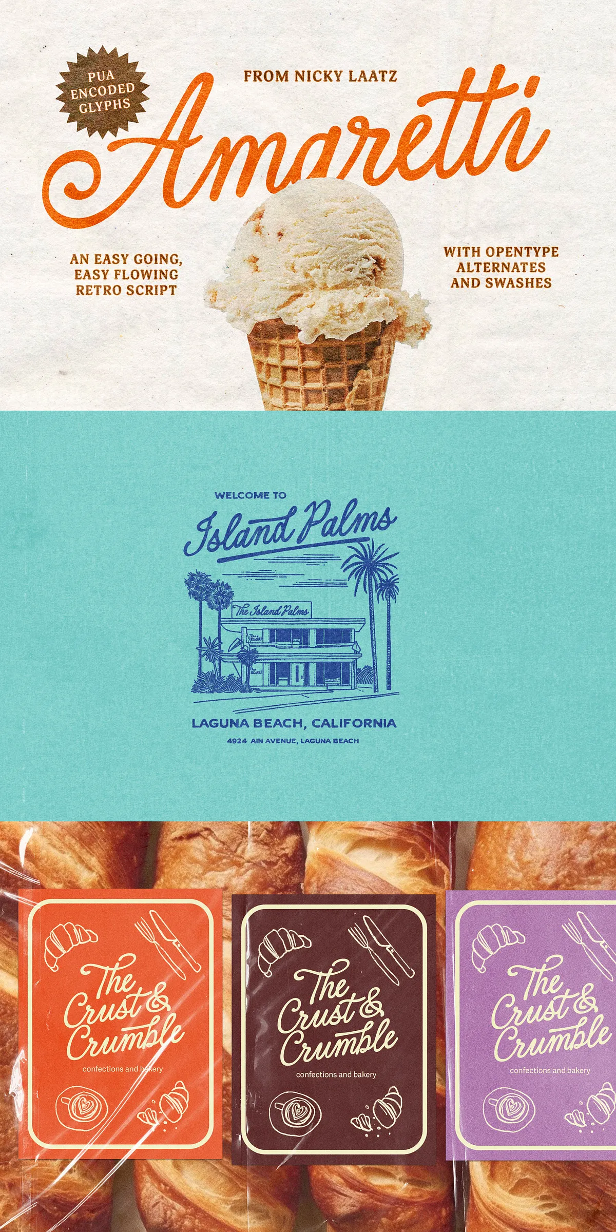 Amaretti is a beautifully designed calligraphic script font that captures the essence of vintage hand-lettered advertising and signage from the 1950s. This font draws inspiration from the elaborate scripts often seen in mid-century commercial art, evoking strong feelings of nostalgia, warmth, and familiarity. With its smooth, flowing strokes and sumptuous swirls, Amaretti brings a playful yet elegant tone to any creative project, adding vibrancy and nostalgic charm.