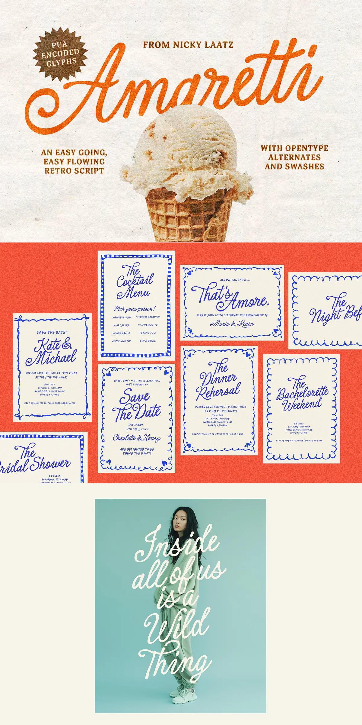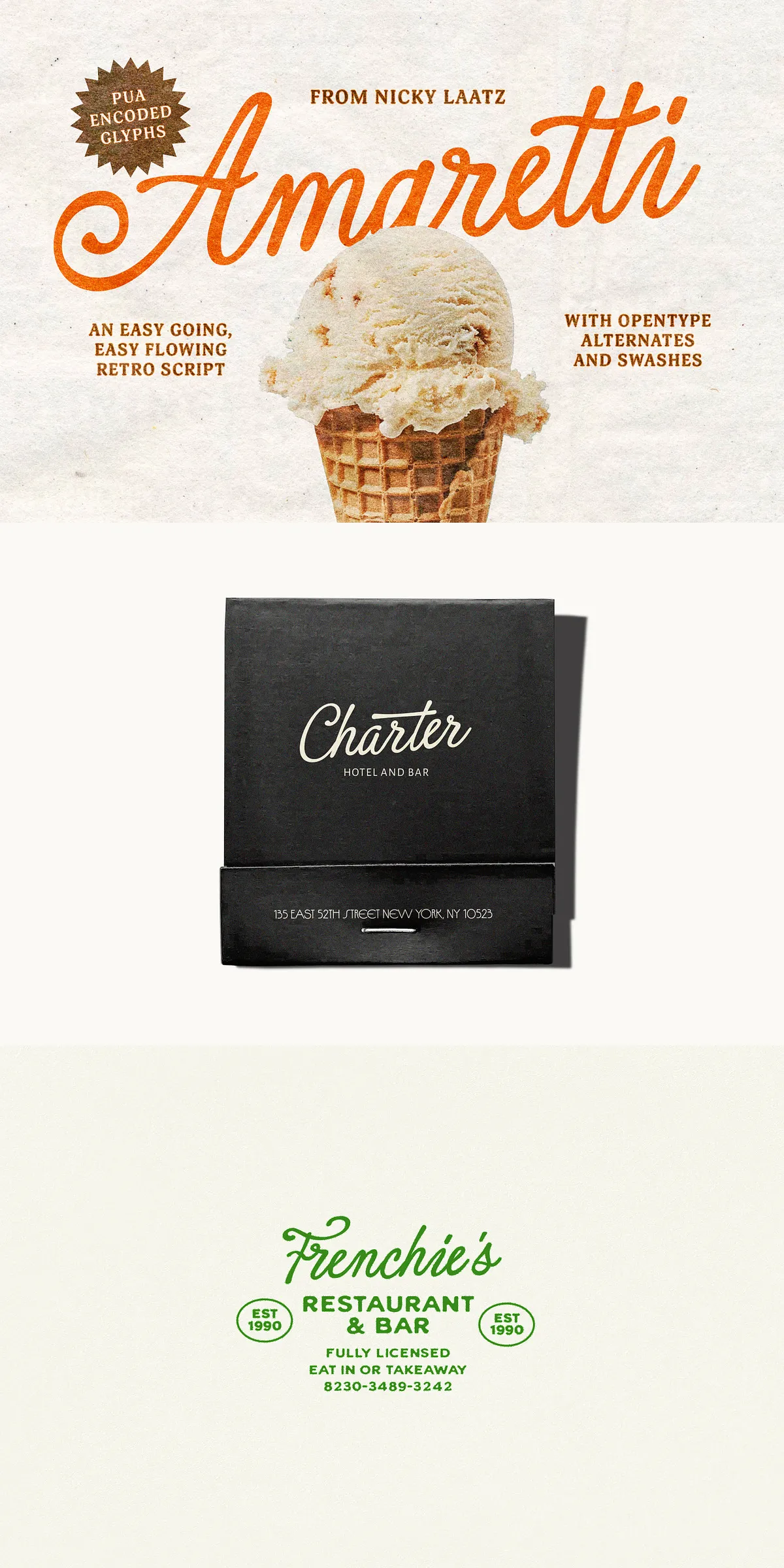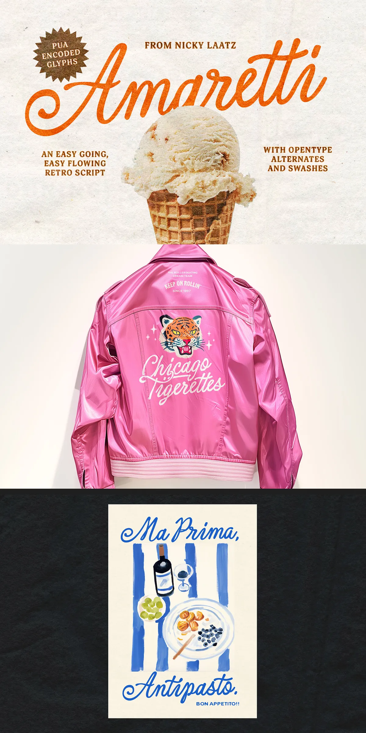 The Amaretti family includes three distinct weights with corresponding oblique versions, enabling designers to tailor the style to match the project’s tone perfectly. Whether you want a more subtle, delicate appearance or a bold, statement-making script, Amaretti provides enough variety to suit multiple applications—from elegant invitations and branding materials to lively packaging and advertising.