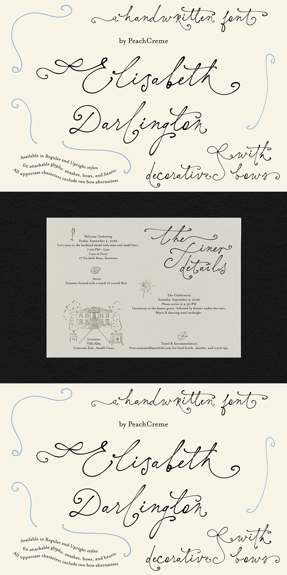 Swashes are not an afterthought—they’re central to the font’s expressive identity. Elisabeth Darlington features two distinct types to give you maximum creative control: