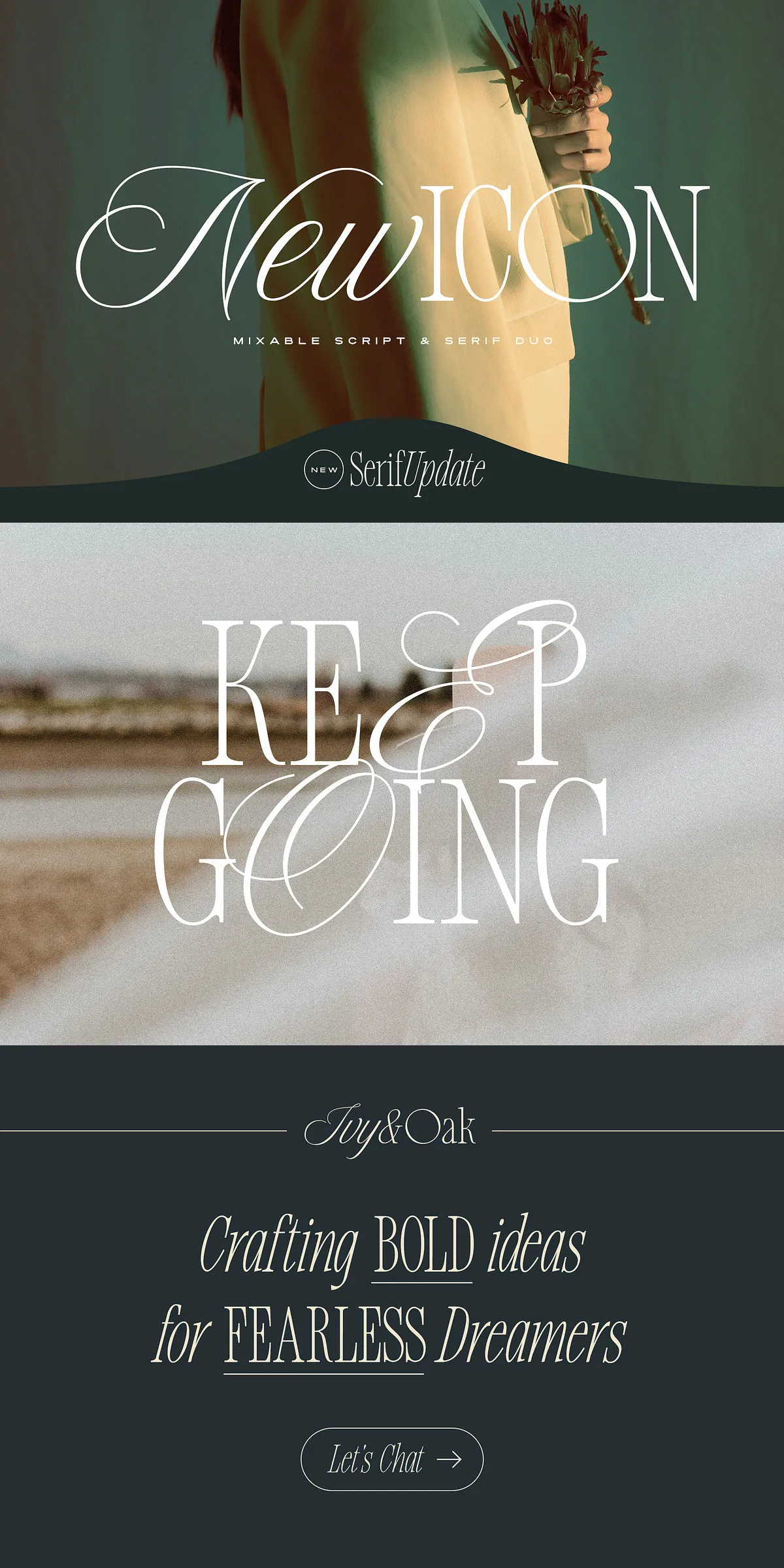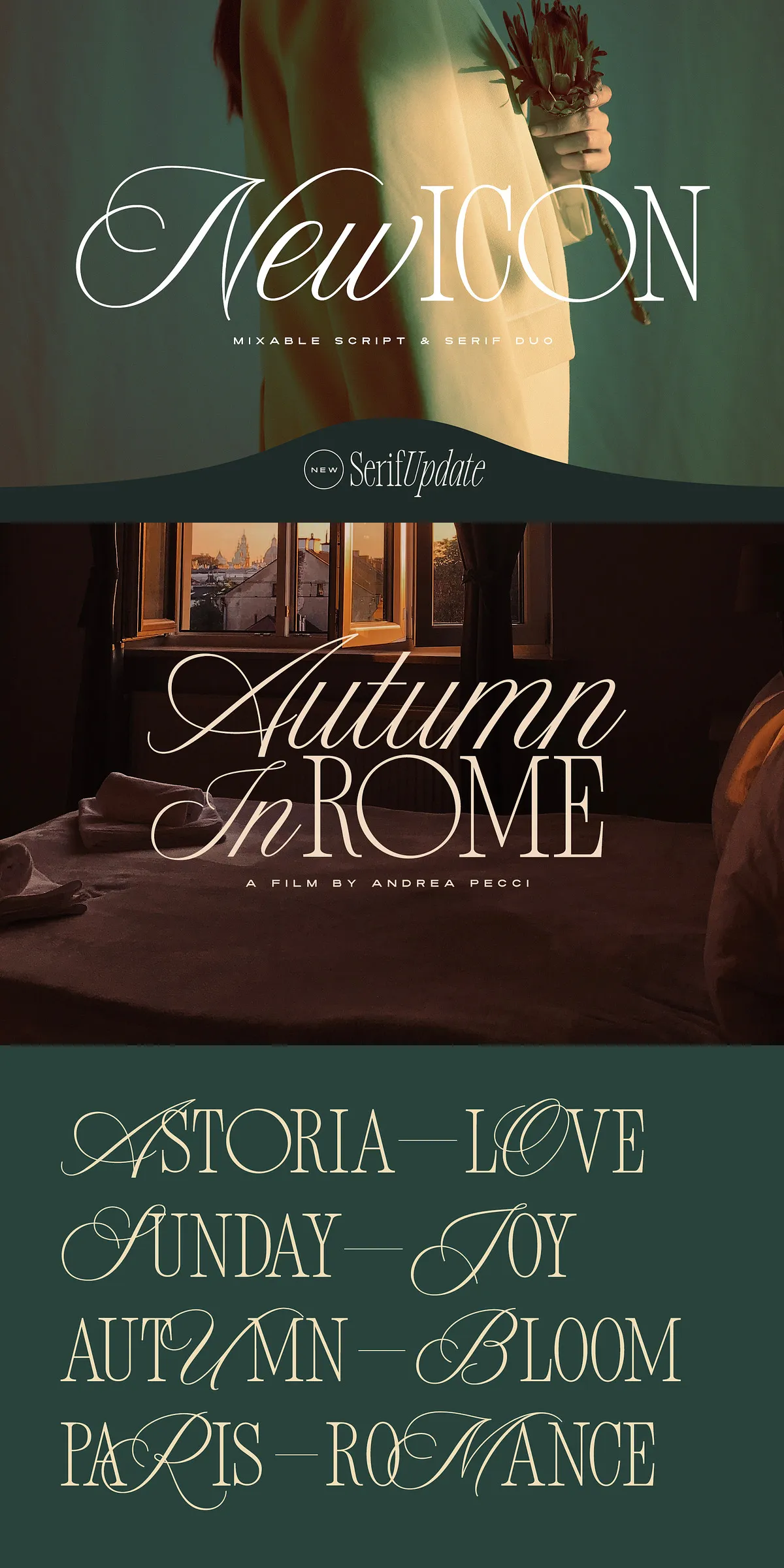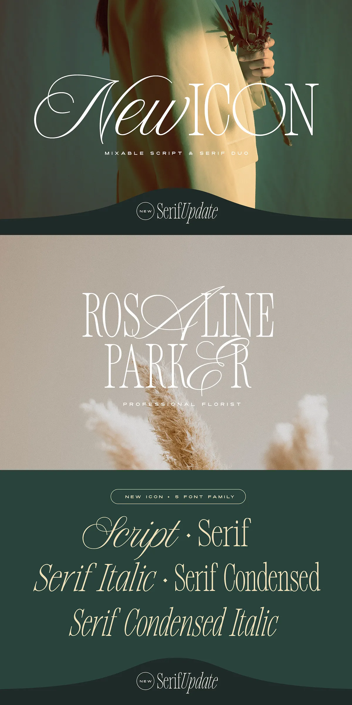 • Pairing options to blend script and serif fonts in a single composition.