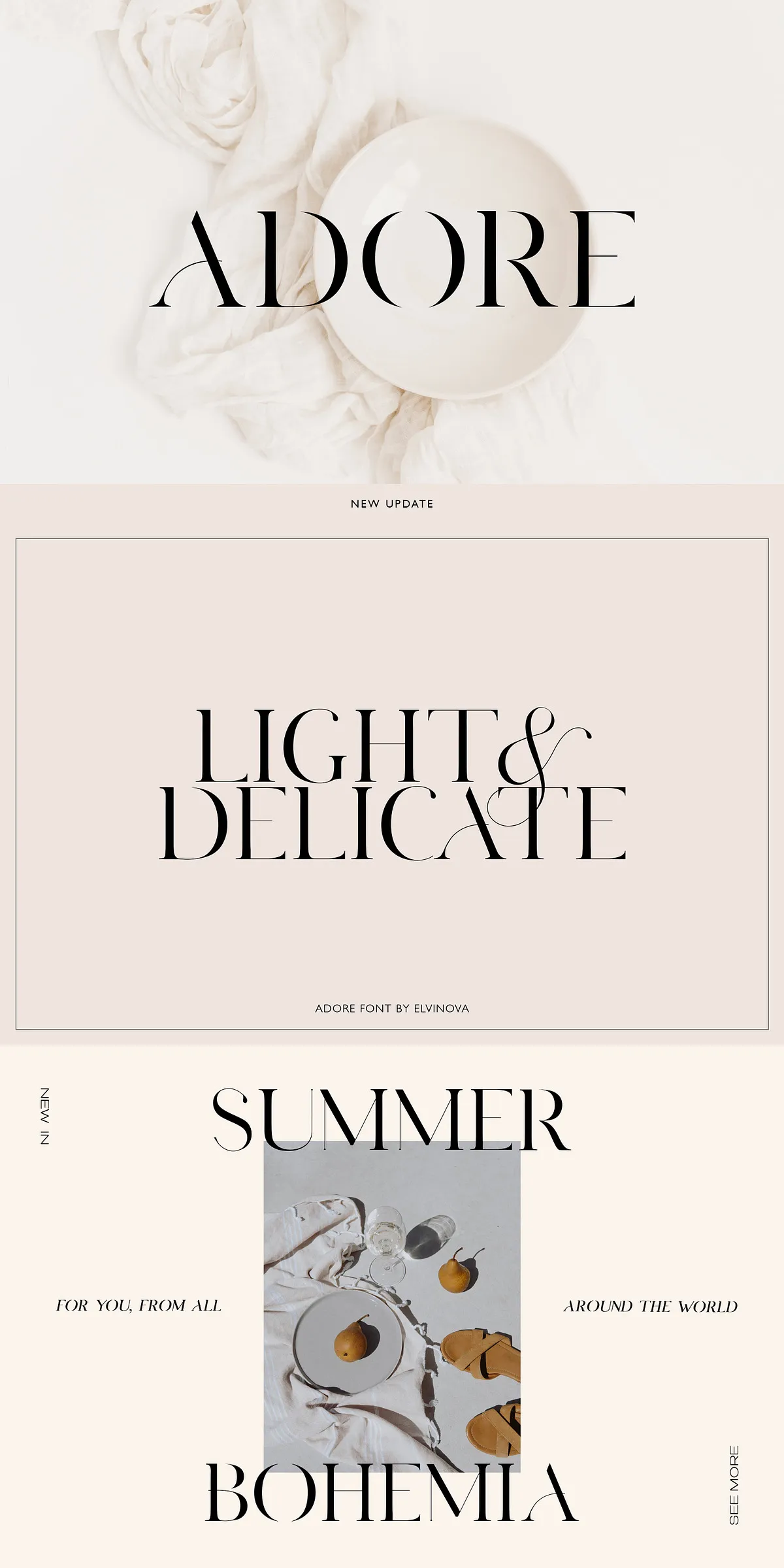 Introducing Adore — a luxuriously refined serif typeface crafted for designers and brands that value grace, precision, and timeless beauty. Fully redrawn and upgraded as of November 1st, 2023, Adore now delivers sharper forms, smoother strokes, and enhanced legibility — all while preserving its original delicate charm. Whether you’re shaping a luxury fashion label, designing a high-end wedding invitation, or crafting editorial layouts, Adore adds a sophisticated whisper of elegance that speaks volumes without shouting.
