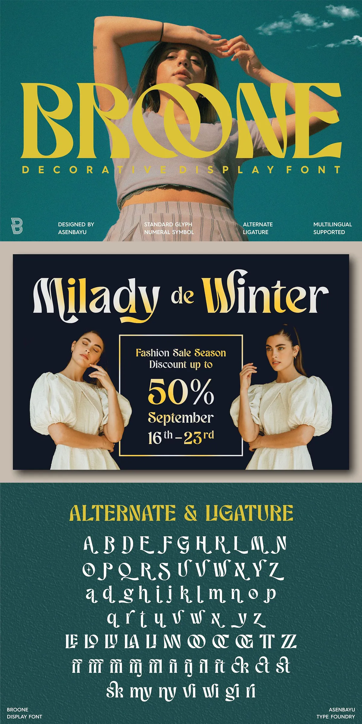 Built-in OpenType features mean these elements activate automatically in modern design software like Adobe Illustrator, InDesign, and Photoshop — no extra plugins or manual work required. Use Broone with confidence, knowing every detail is ready to be leveraged.
