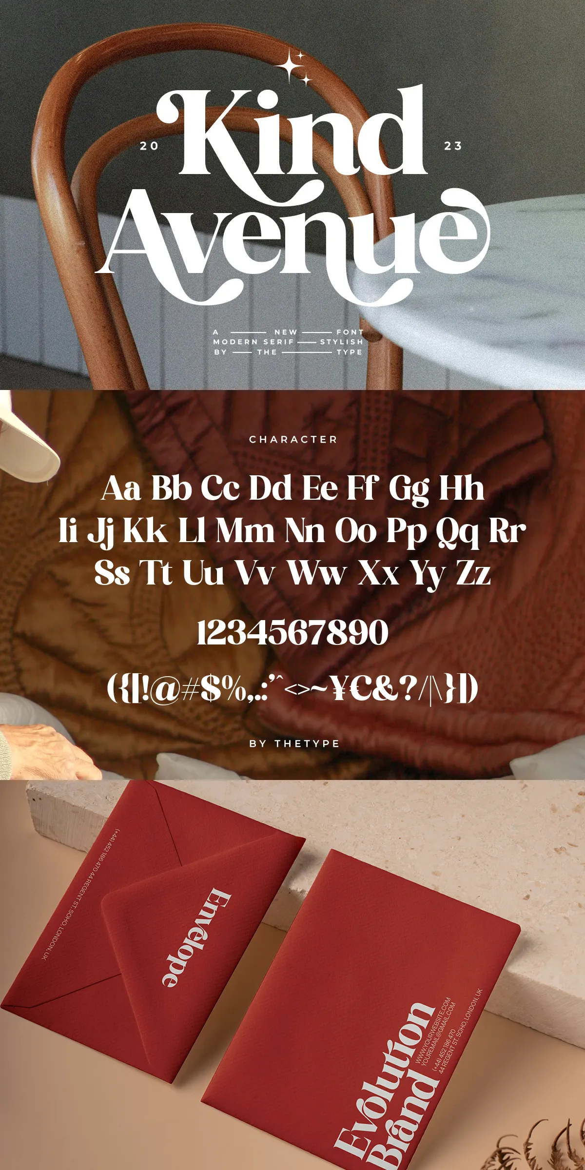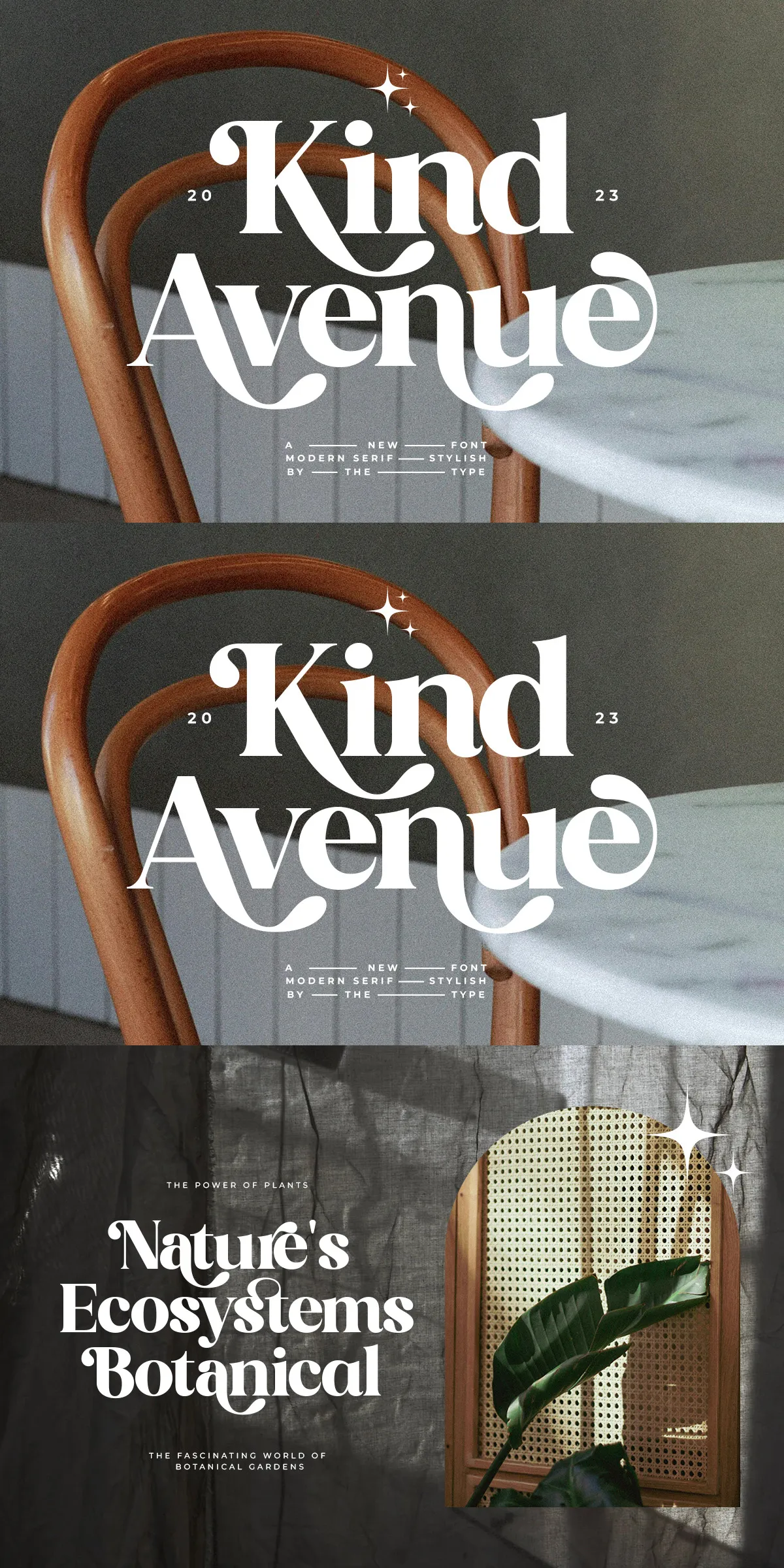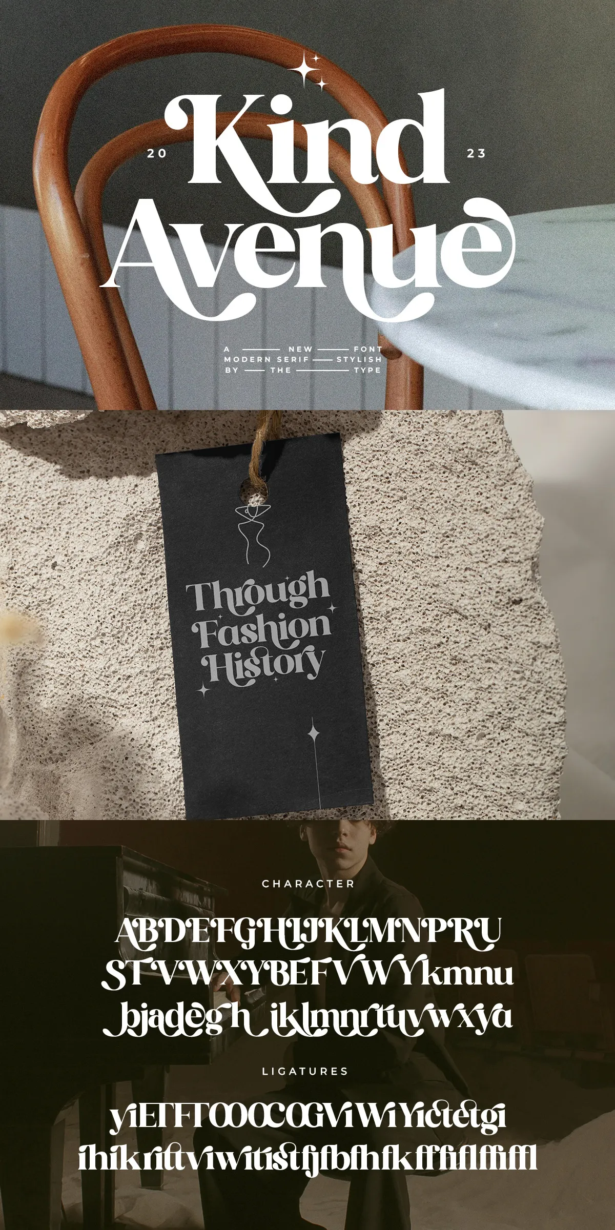 Imagine designing a coffee shop branding kit: start with a solid, retro-serif appearance for the business name — dependable and trustworthy — then use expressive ligatures and alternate forms for the tagline, making it pop with personality. That’s the power of Kind Avenue. It’s designed for you to control the tone, mood, and impact.