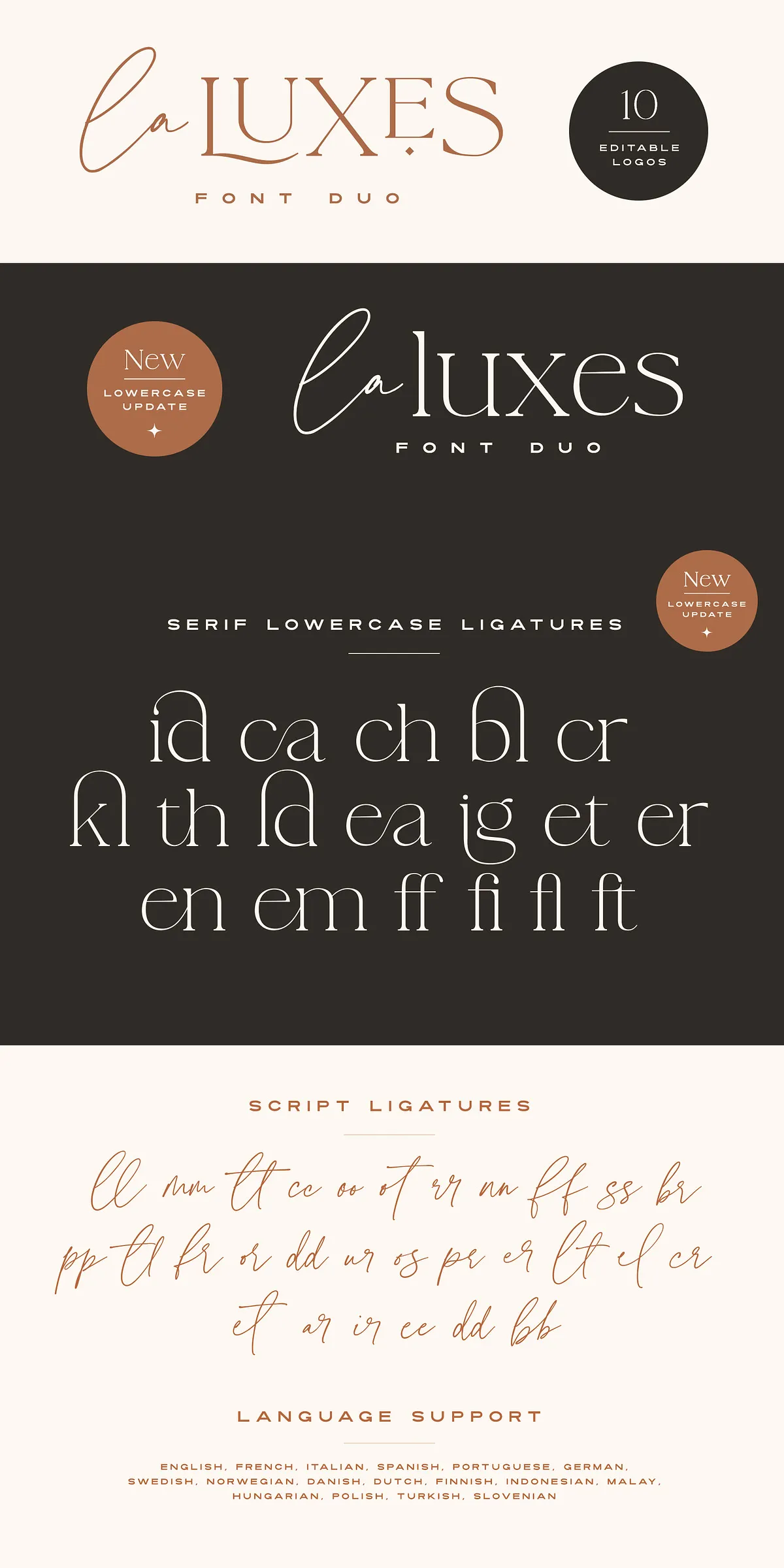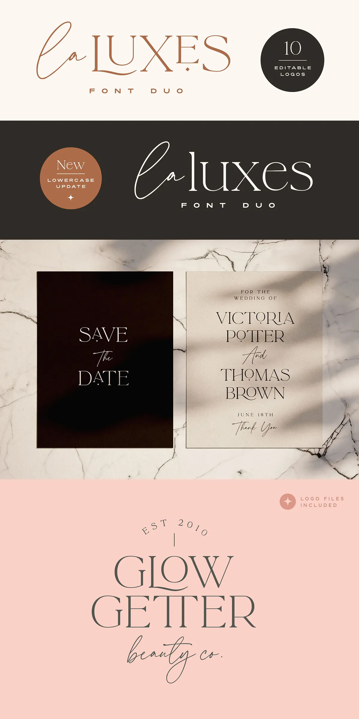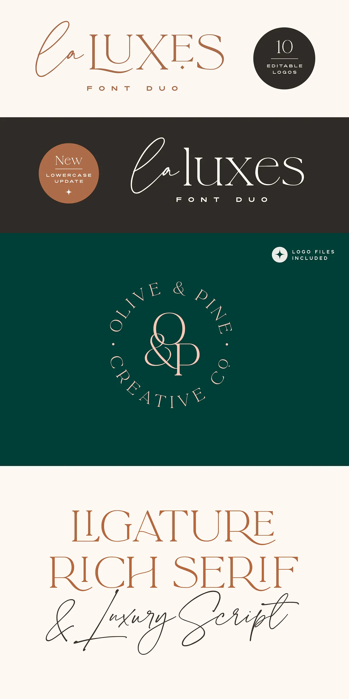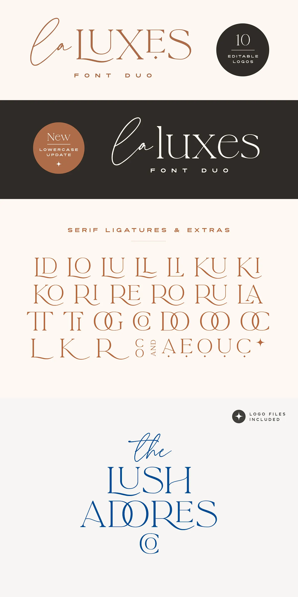 Complementing the script perfectly, the La Luxes Serif is a powerful all-caps serif that redefines modern elegance. It includes both uppercase and new lowercase characters, ensuring versatile use across headings, body text, and display settings. With 38 ligatures and 11 unique special characters, including stylized ‘AND’ and ‘CO’ icons, this serif gives you endless layout options for premium brand identities and editorial design.