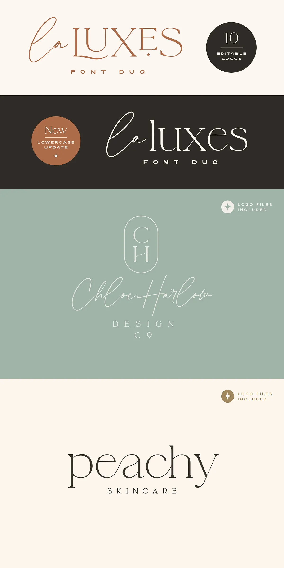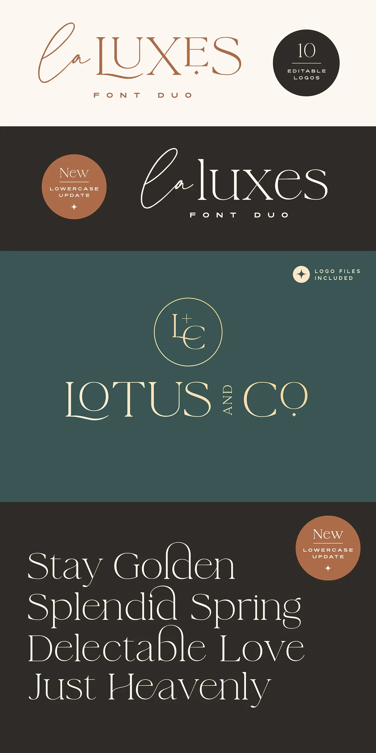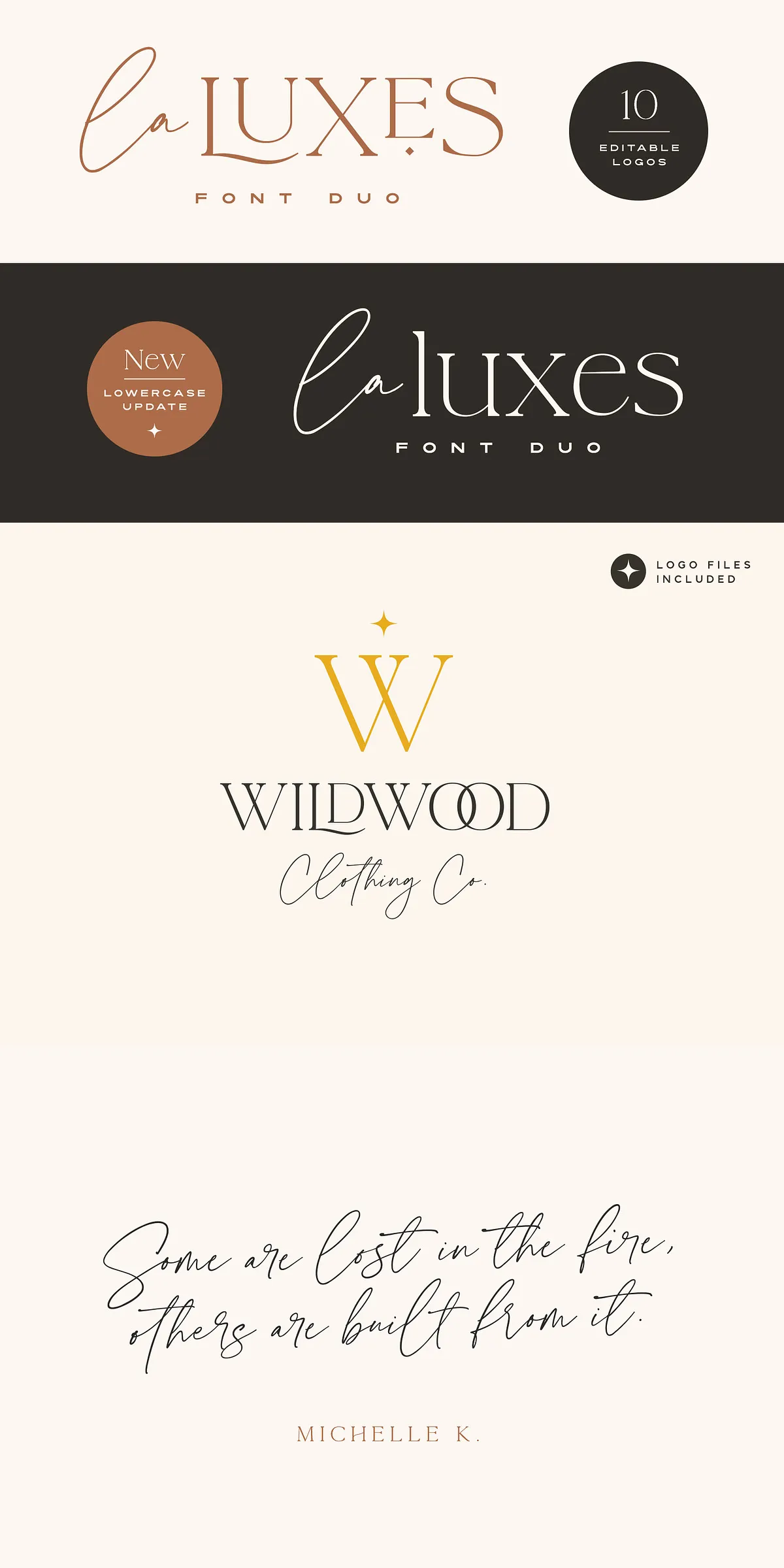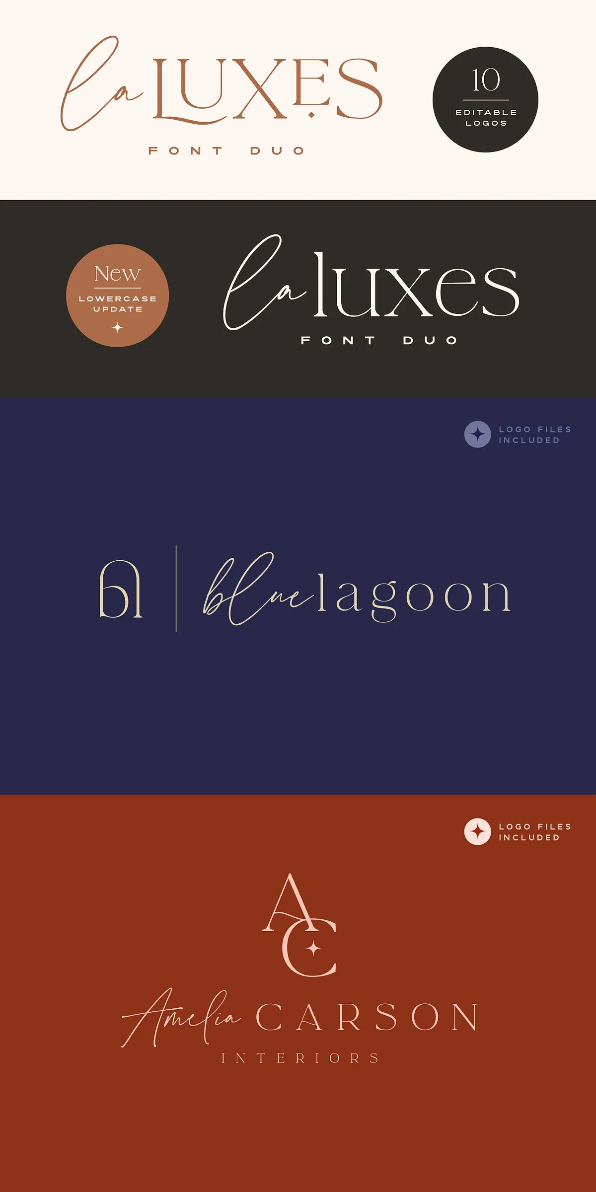 Complementing the script perfectly, the La Luxes Serif is a powerful all-caps serif that redefines modern elegance. It includes both uppercase and new lowercase characters, ensuring versatile use across headings, body text, and display settings. With 38 ligatures and 11 unique special characters, including stylized ‘AND’ and ‘CO’ icons, this serif gives you endless layout options for premium brand identities and editorial design.