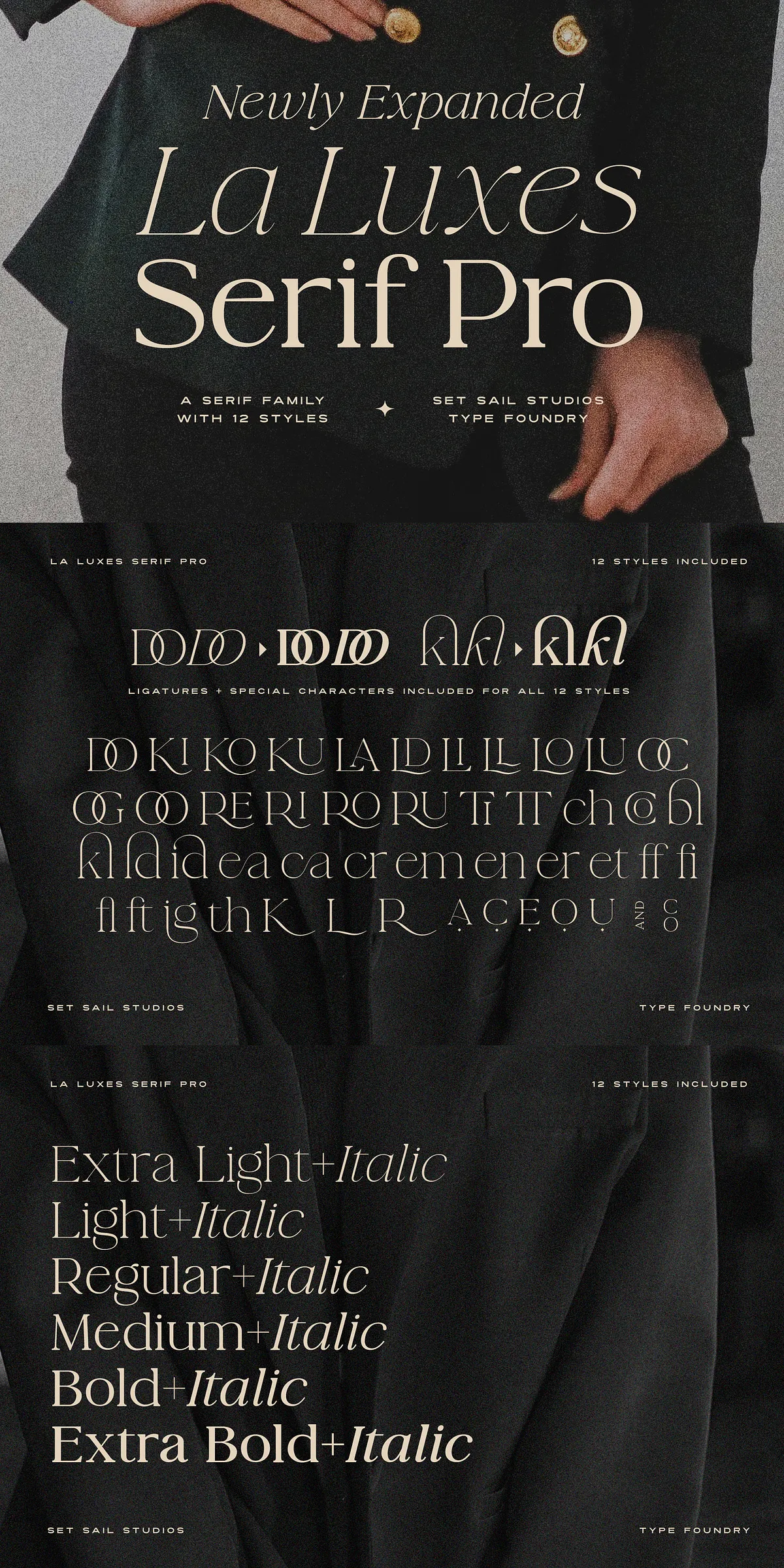 Designers who loved the original La Luxes Serif now have even greater control. Each weight — from delicate Light to commanding Black — has been refined for precision, balance, and visual impact. Whether you’re crafting a luxury brand identity, a high-end magazine spread, or a bold website hero section, La Luxes Serif Pro delivers the sophistication and presence your vision demands.