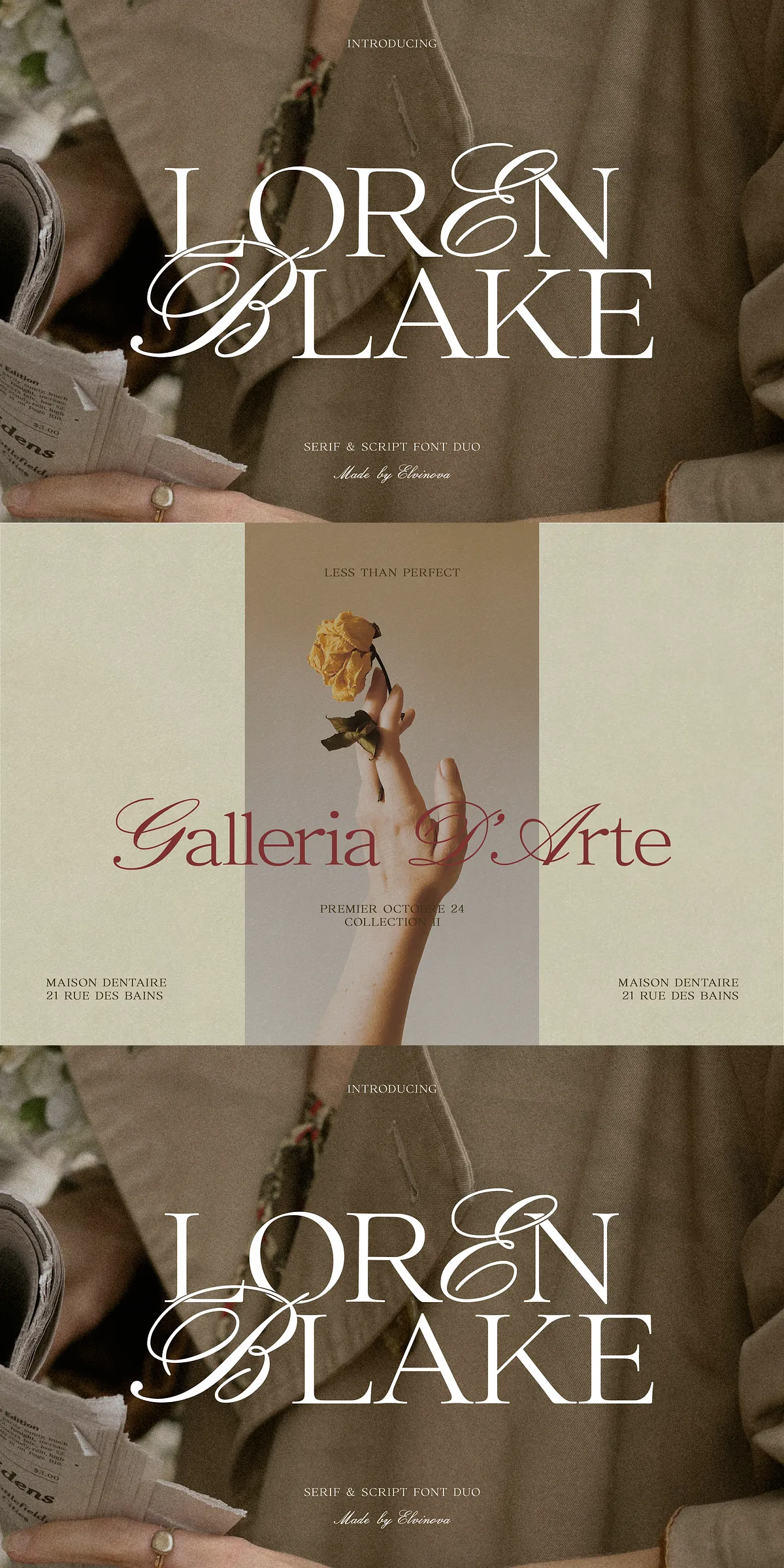 • Loren Blake Hybrid (OTF) — The perfect bridge between the two. This advanced font combines the strong structure of the serif with the expressive flow of the script, enabling seamless transitions and dynamic typographic compositions.