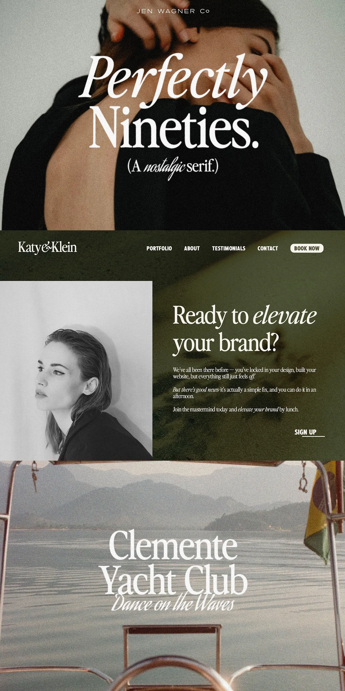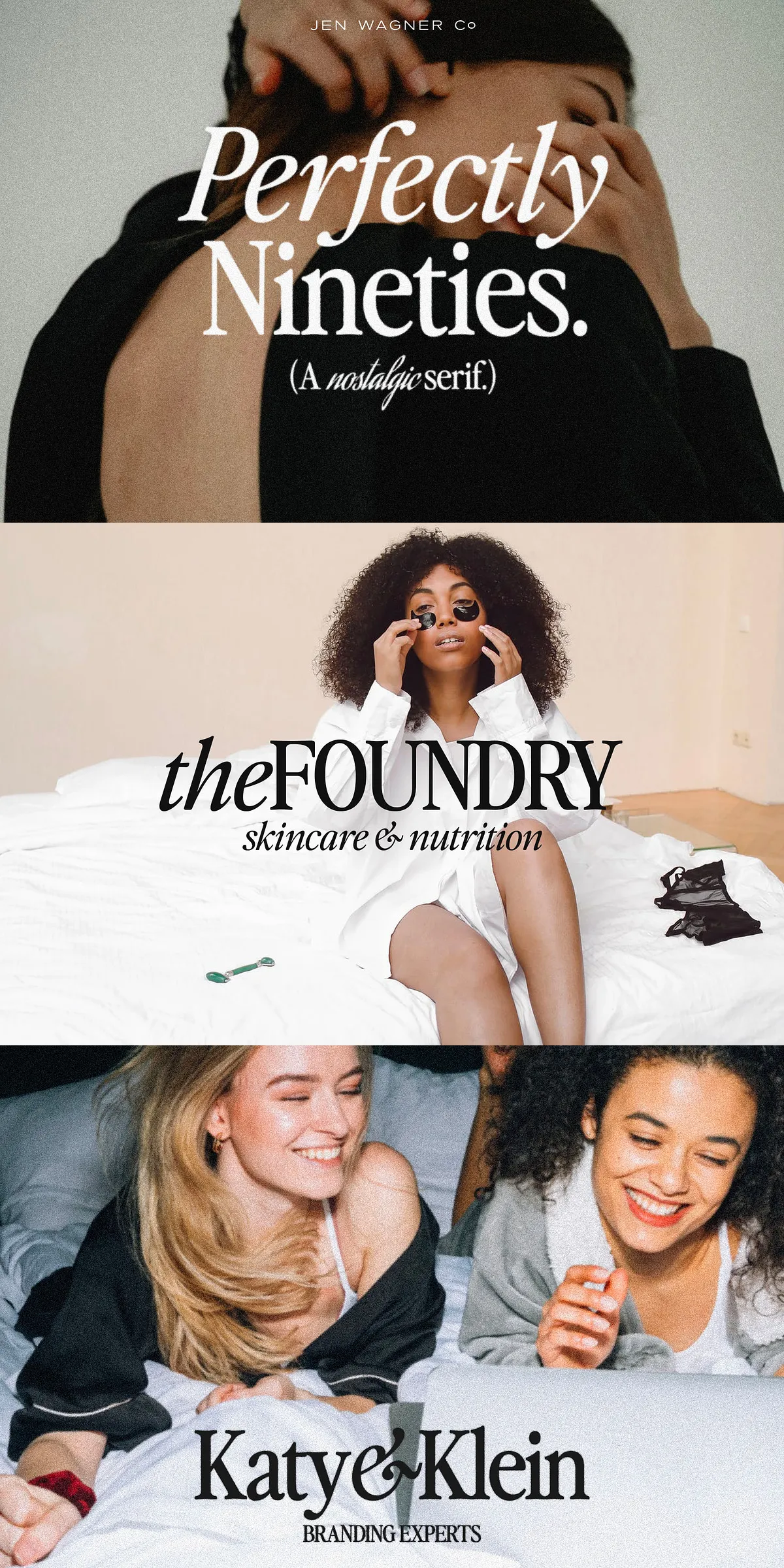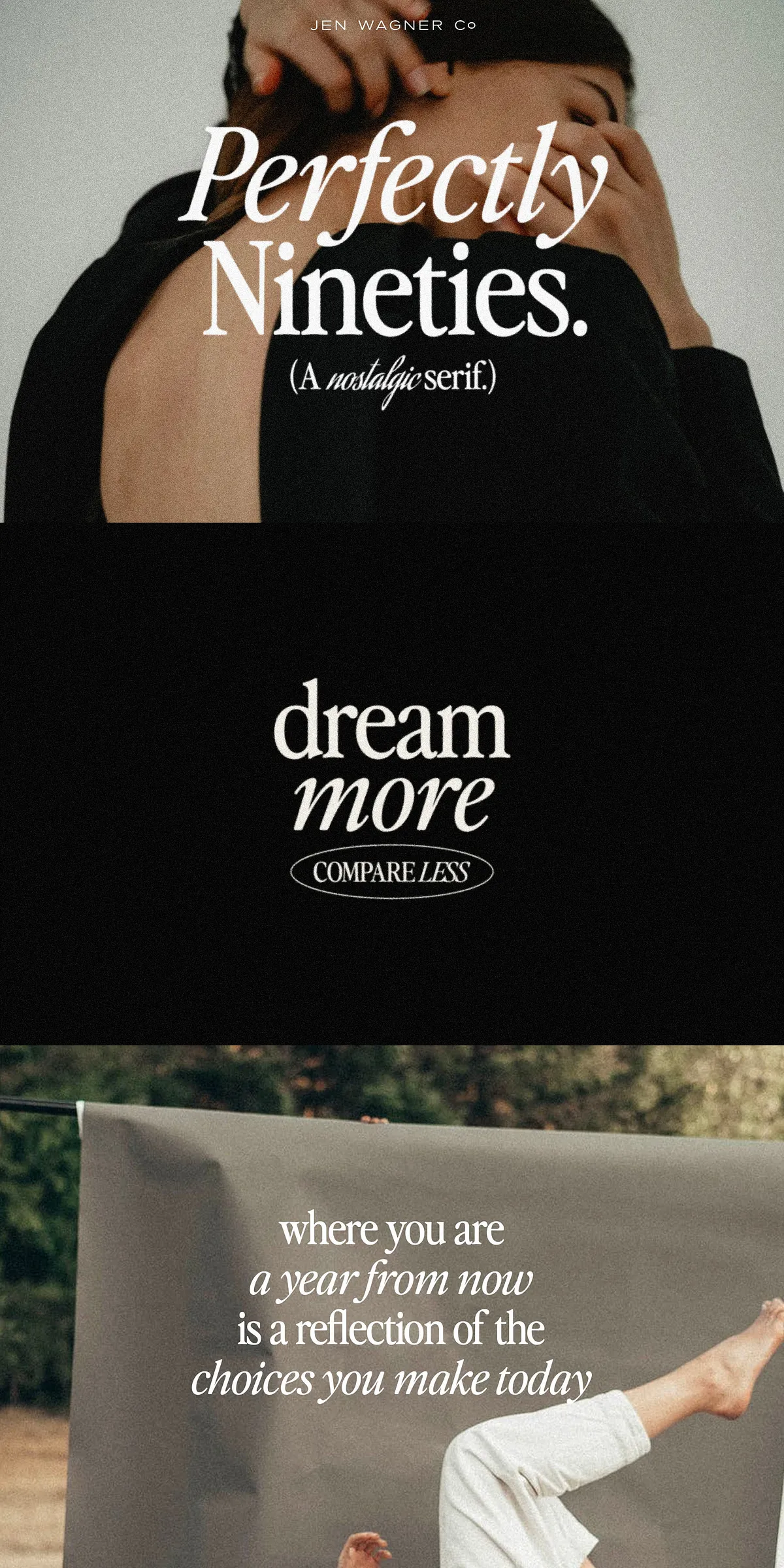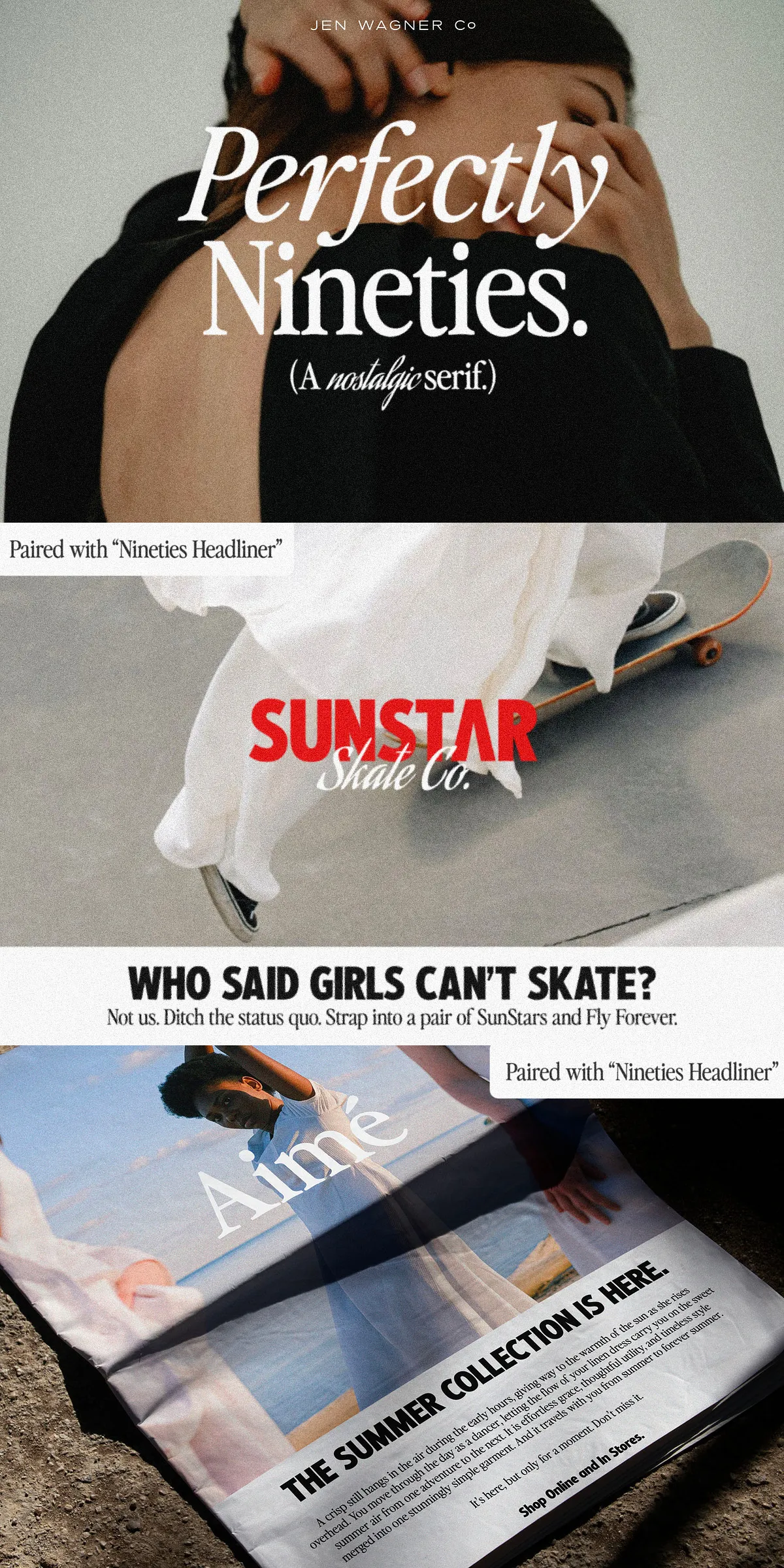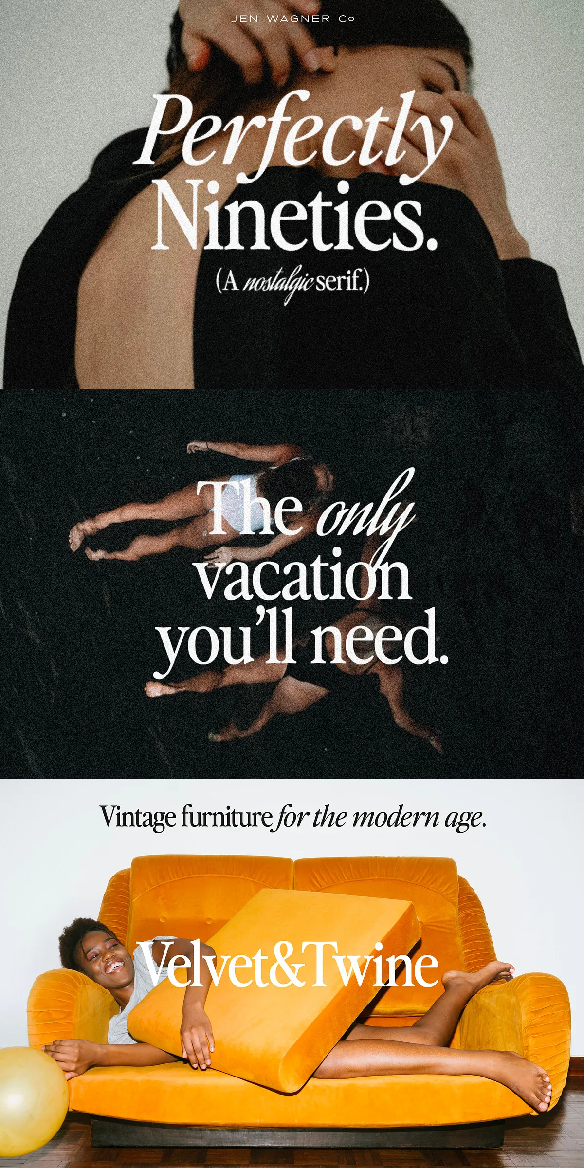 • Pair Perfectly Nineties with a clean sans-serif like Inter or Helvetica for body copy when using it in display-heavy layouts.